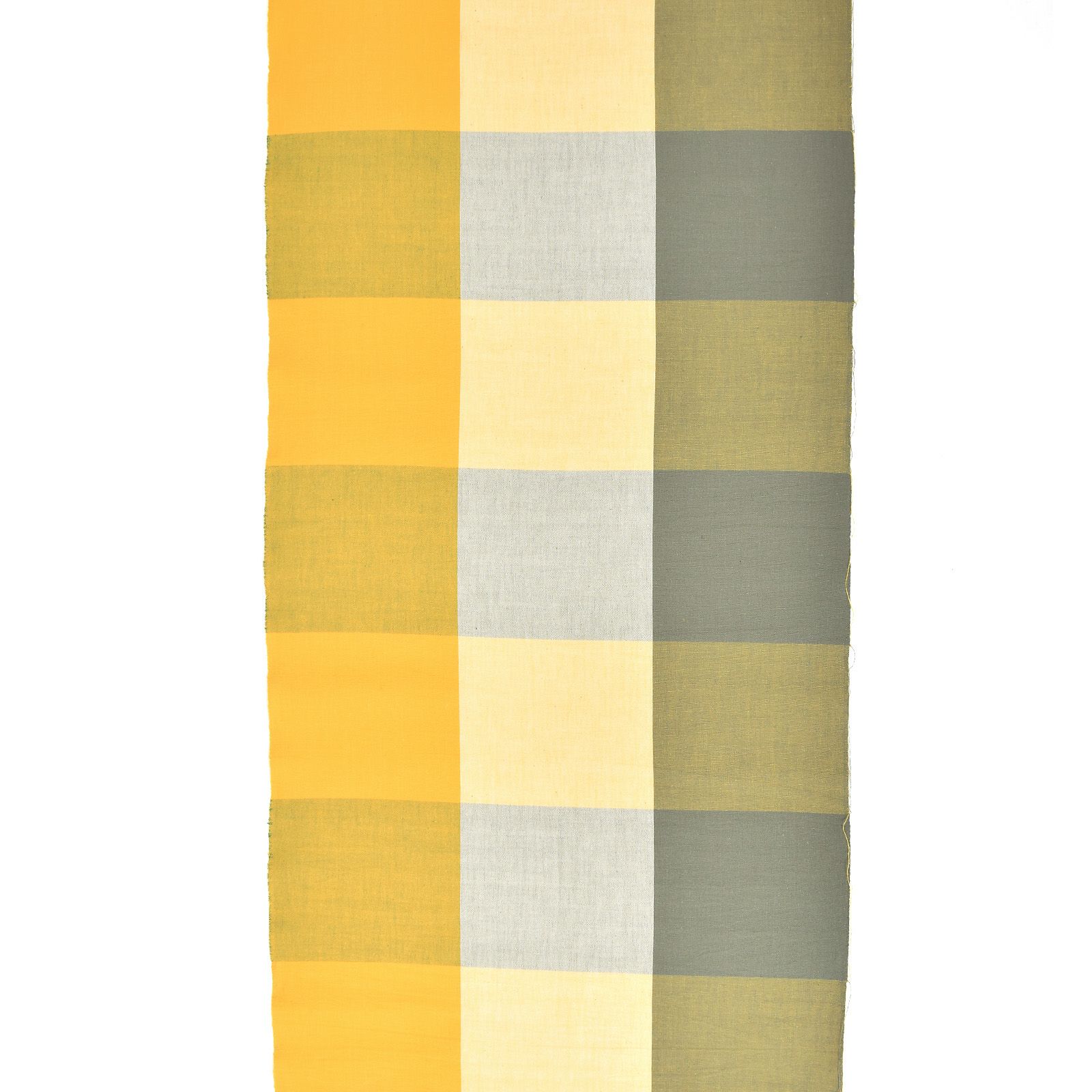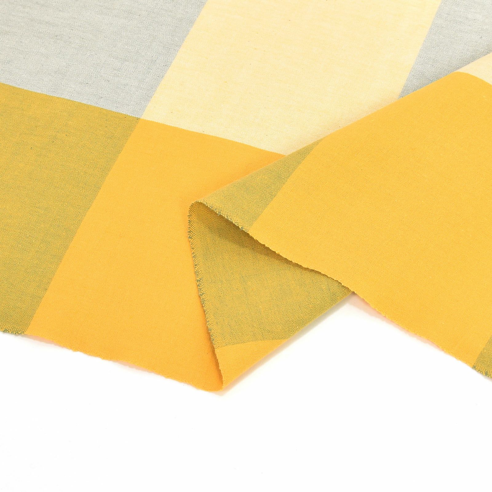 山吹色、薄黄色、浅いカーキに、淡いグレーの横段を重ねた約14cm角ほどのブロックチェック。黄金の畑のような明るさとナチュラルな雰囲気がある格子です。