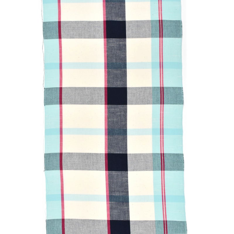【色柄】中央に濃紺、端に空色、中間にオフホワイト、浅い赤紫色の細縞。横段に淡い同色を重ねた格子。明るさと爽やかさを感じさせます。