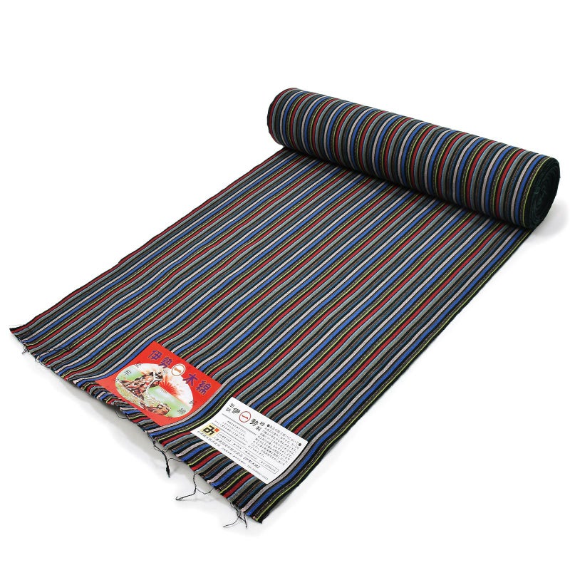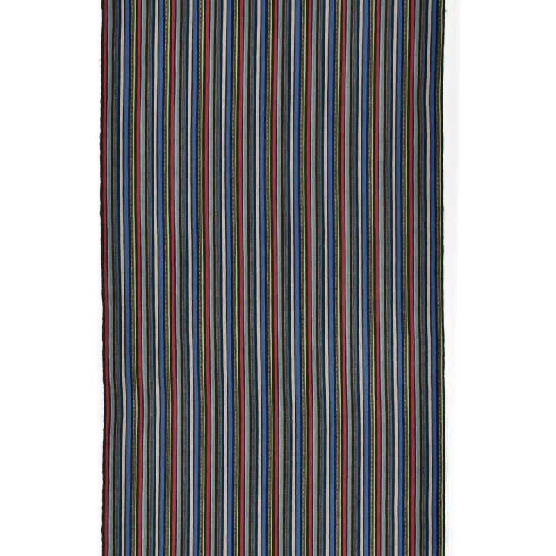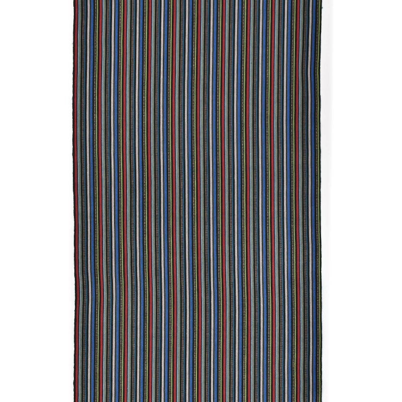 【色柄】黒に青、落ち着いた赤、黄緑色、薄橙色、ごく細かな黄色などのランダムな縦縞。中性的な印象のストライプです。