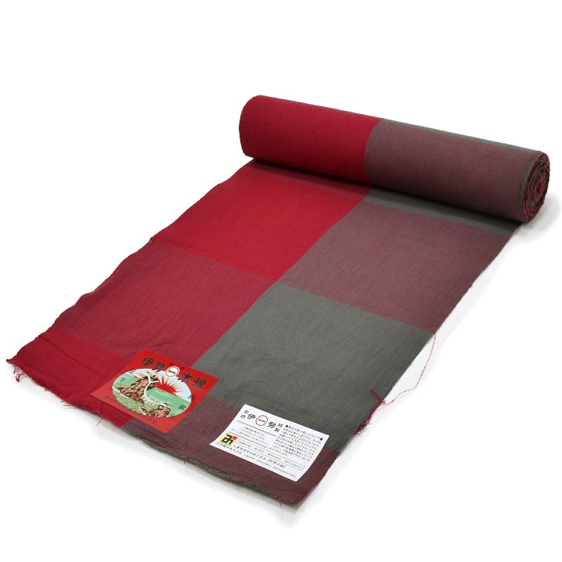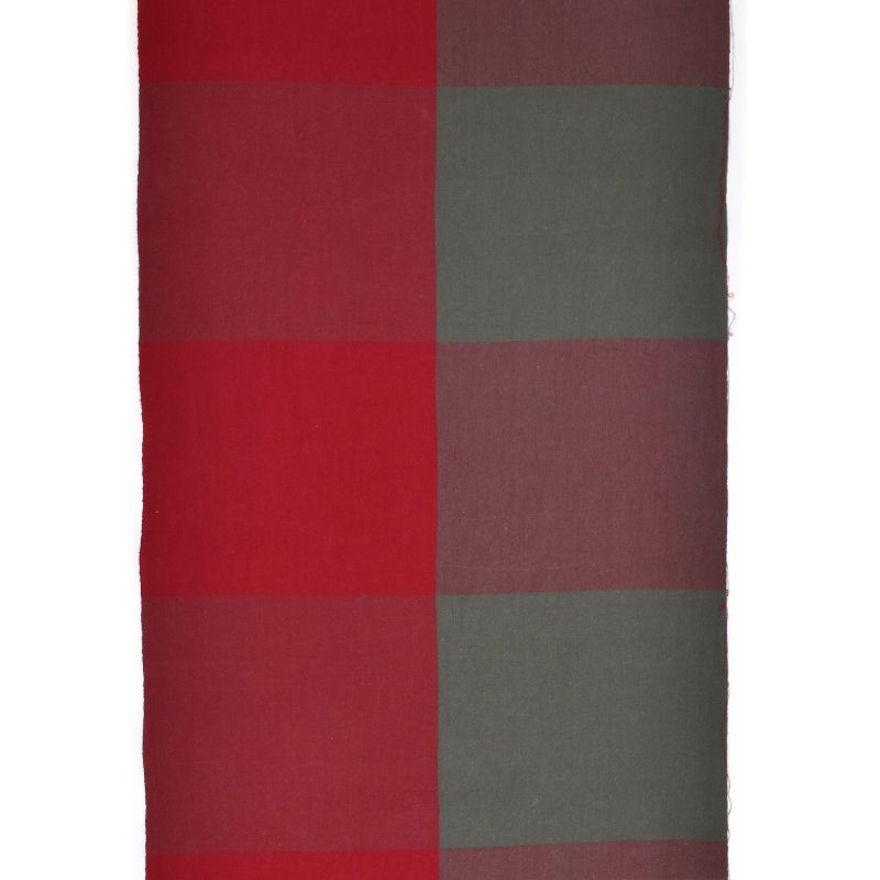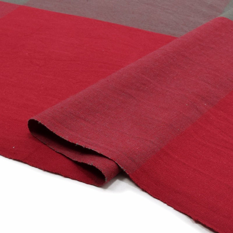 【色柄】赤と鈍いグレーの縦割りの地、横段に薄い赤と薄グレーを重ねた約20cm角ほどのブロックチェック。大きな構成なので柄の取り方で雰囲気が変わります。