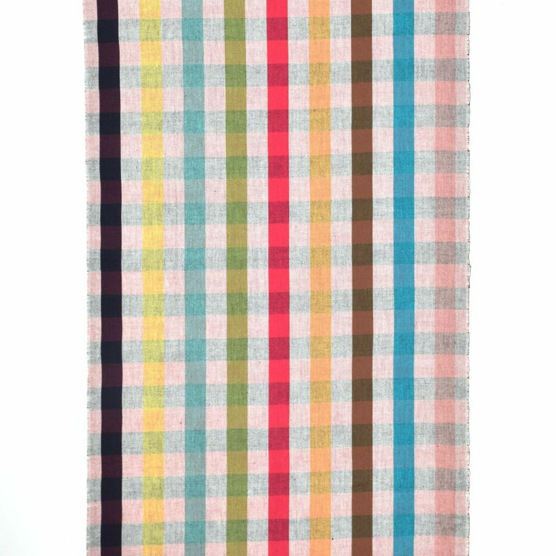 【色柄】全体に白くかすれた杢の地。淡い紺と薄紅の横段、紺に淡い黄色、ミントグリーン、黄緑、ターコイズ、中紅、薄ピンク、茶など約2cm強の同じ太さの縞を重ねた格子。彩りが楽しい格子です。