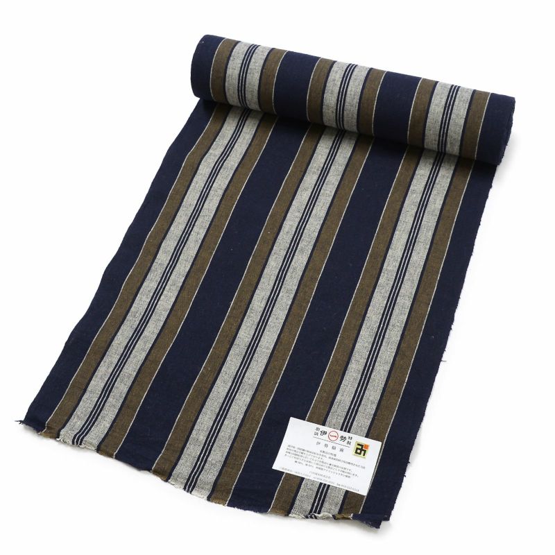 【色柄】紺地に紺の三本縞、白、媚茶の大きな両子持ち縞。トラッド感のある落ち着いた縞です。