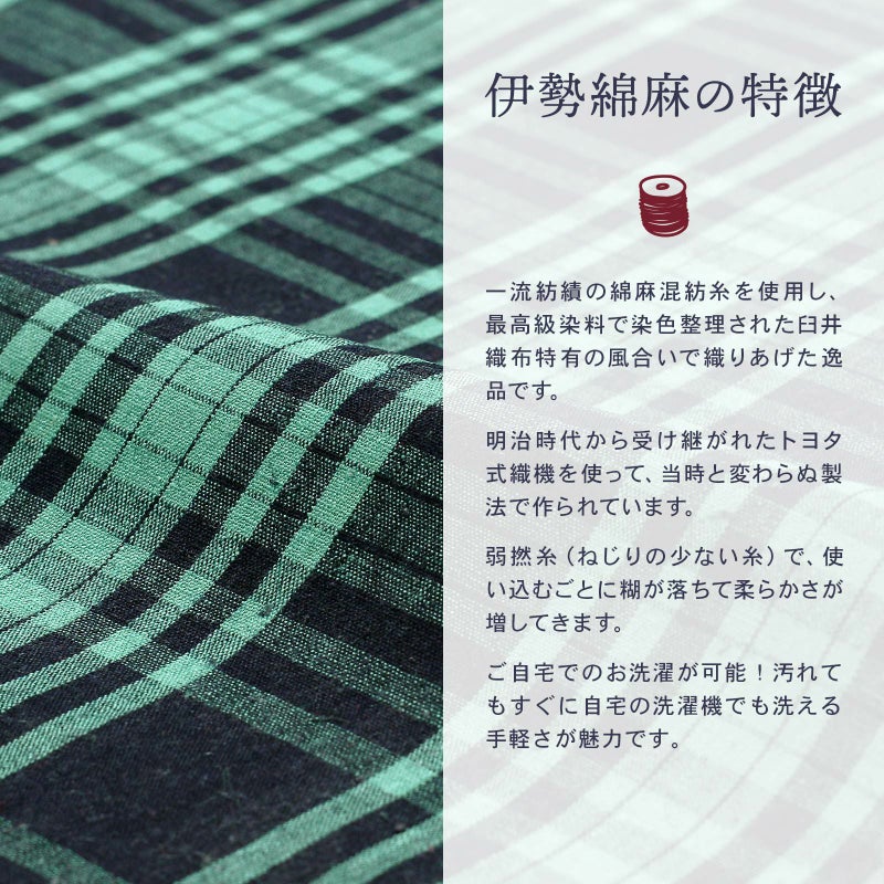 一流紡績の綿麻混紡糸を使用し、最高級染料で染色整理された臼井織布特有の風合いで織りあげた逸品です。