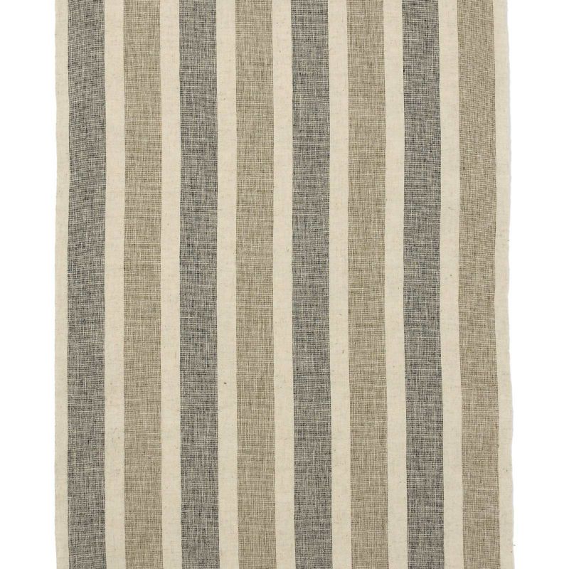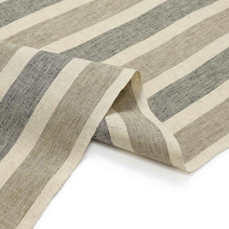 【色柄】生成り色の地に、縦筋の入った杢調の浅い黒、白茶色の縦縞が等間隔に配置されたデザイン。穏やかな色調が大人っぽいストライプです。