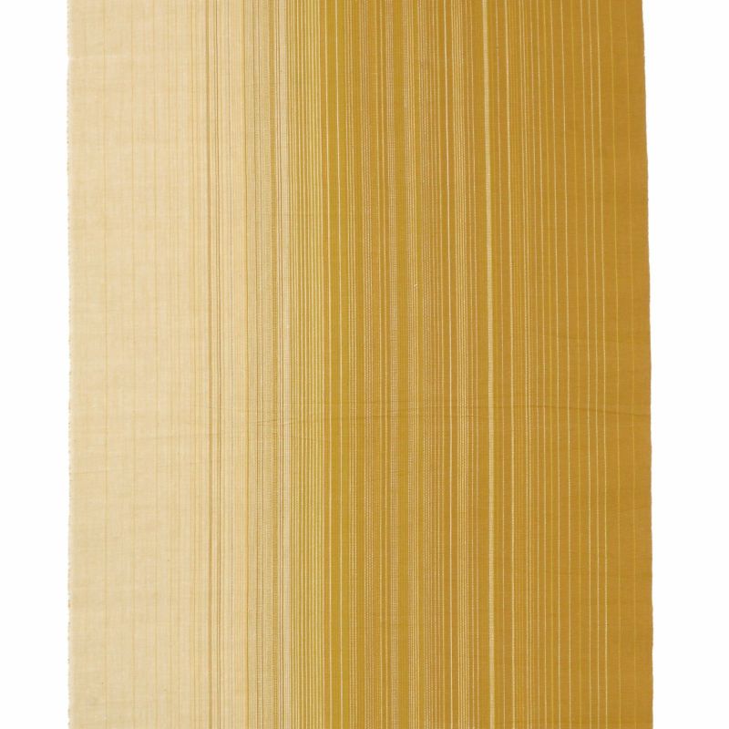 【色柄】黄みの黄土色と生成り色の地に黄色、薄いからし色、浅いベージュ、白などの筋が徐々に間隔が狭くなるよう配置されています。落ち着いた色彩と大胆な縞がおしゃれな印象です。