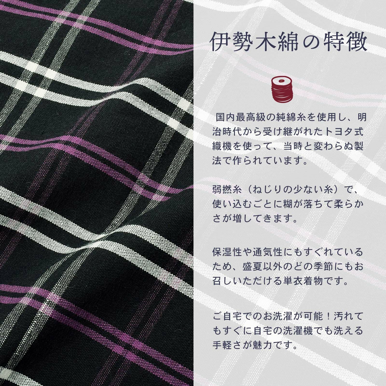 他の画像を見る 送料無料 やわらかく、どこかぬくもりが感じられる「伊勢木綿」の未仕立て着物 反物 伊勢木綿 洗える着物 反物 「格子 黒地、白×紫(紫蘇)」 未仕立て 木綿きもの 日本製 三重県 伝統工芸品 単衣 綿 カジュアル チェック 小紋 レディース キモノ kimono 【メール便不可】 きもの町価格 ¥ 39,600 税込 在庫切れ 詳細を見る お気に入りに登録する