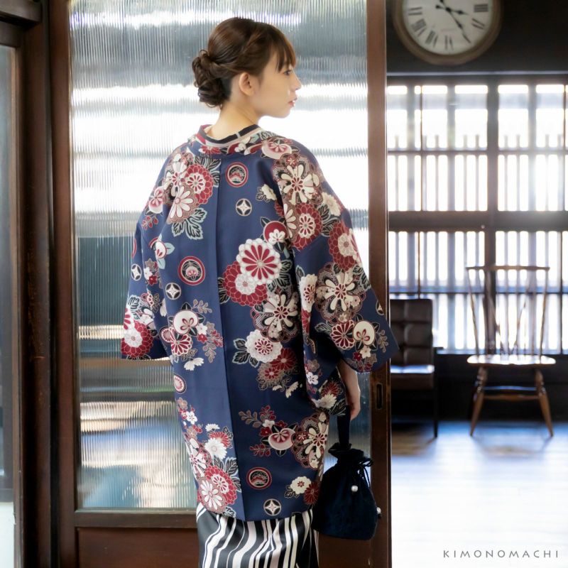 長めの丈なので、シルエットがすっきりと見えます。小紋や紬などのカジュアルな普段のお着物に合わせて、お洒落を楽しんでいただけます。少し肌寒い春先、秋、冬口などのサッと羽織って防寒対策に良いですね。羽織は洋服でいうところのカーディガンやジャケットのようなもので、コートと違い、室内でも着用していただけます。