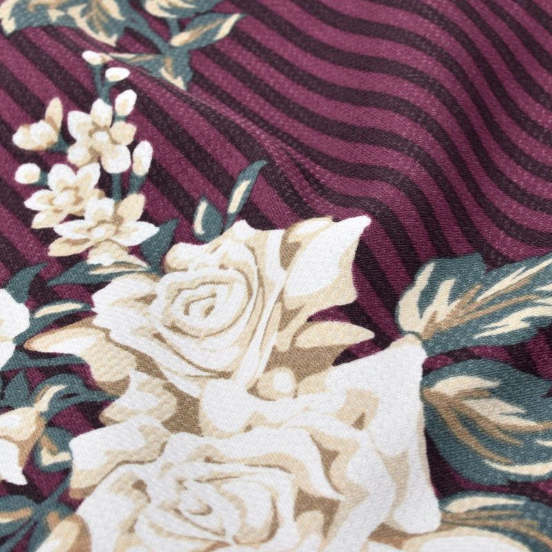 【色柄】細かな地模様のある生地。ややグレイッシュな紫にごく濃い黒紫色の斜めストライプの地、白にグレージュ、灰白色のバラのブーケが飛び柄で表現されたスタイリッシュなデザイン。裏地はネイビー。