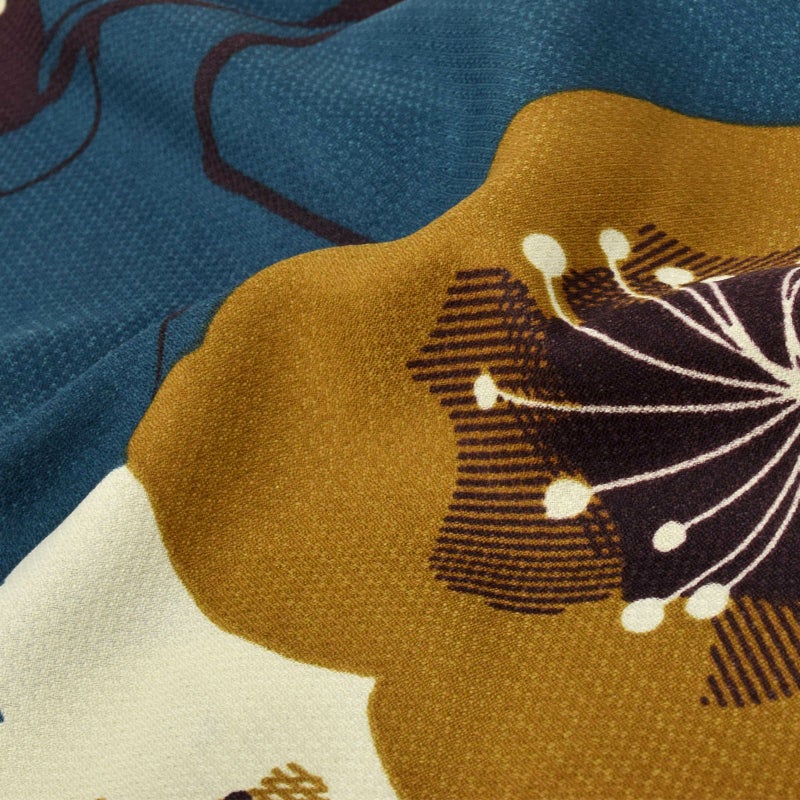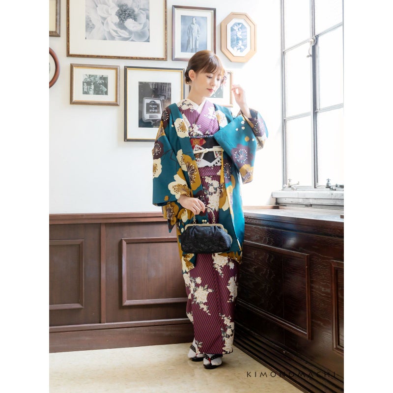 細かな地模様のある生地です。落ち着いたテールグリーンの地に、黄土色、生成り色、セピア色の大胆な印象にデザインされた梅の花。花の中心は、ぼかしではなく線を重ねた表現となっています。直線的でエッジのある梅の花の形に、丸く古典的な雰囲気の枝やつぼみが懐かしさを添える、モダンでありながらレトロな魅力のある着物です
