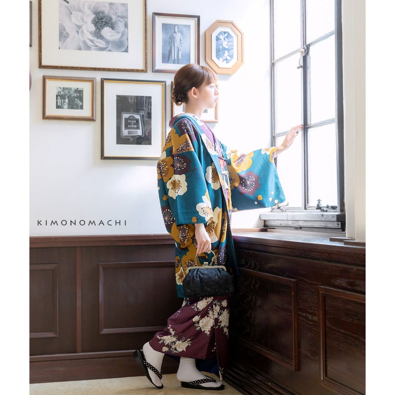 長めの丈なので、シルエットがすっきりと見えます。小紋や紬などのカジュアルな普段のお着物に合わせて、お洒落を楽しんでいただけます。少し肌寒い春先、秋、冬口などのサッと羽織って防寒対策に良いですね。羽織は洋服でいうところのカーディガンやジャケットのようなもので、コートと違い、室内でも着用していただけます。