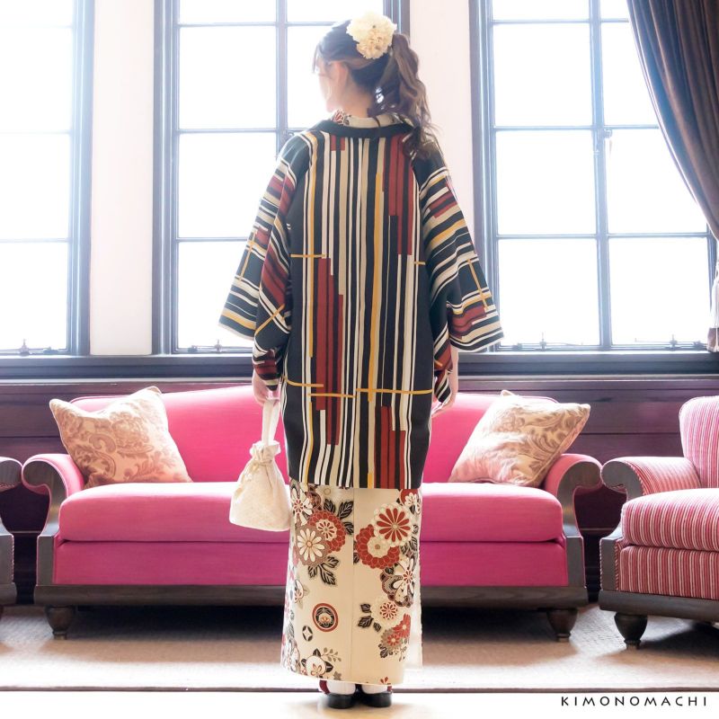 長めの丈なので、シルエットがすっきりと見えます。小紋や紬などのカジュアルな普段のお着物に合わせて、お洒落を楽しんでいただけます。少し肌寒い春先、秋、冬口などのサッと羽織って防寒対策に良いですね。羽織は洋服でいうところのカーディガンやジャケットのようなもので、コートと違い、室内でも着用していただけます。