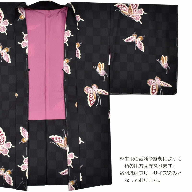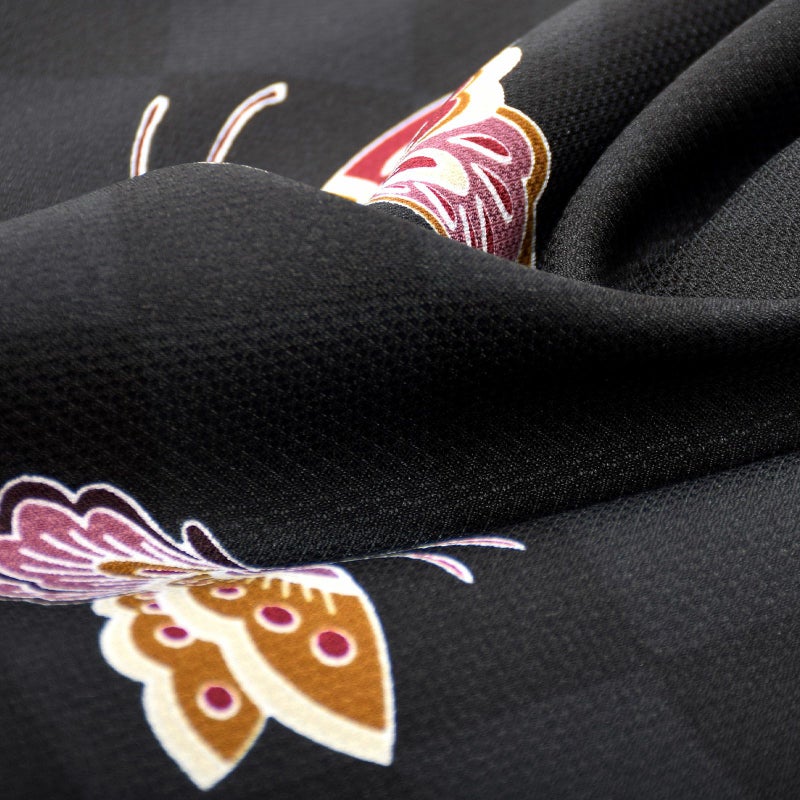 細かな地模様のある生地。黒と深い藍墨色の市松模様の地に、大中小の蝶が飛び交うデザイン。蝶は淡い生成り色に深い赤紫色や浅紫、黄土色の配色。黒系の地に細やかな模様の羽根の蝶が引き立ちます。裏地は浅い紫色。