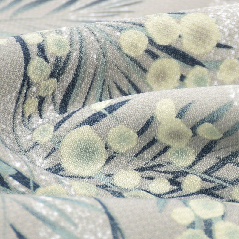 細かな地模様のある生地。グレーの地に白くかすれた立涌文様。その上にふっさりと花をつけたミモザの模様。灰白色にブルーグレーやグレージュのぼかしの入った丸い花々、深い青緑色の羽根状の葉。シックな色合いと、模様の曲線的なやわらかさが魅力的なデザインです。裏地は白。