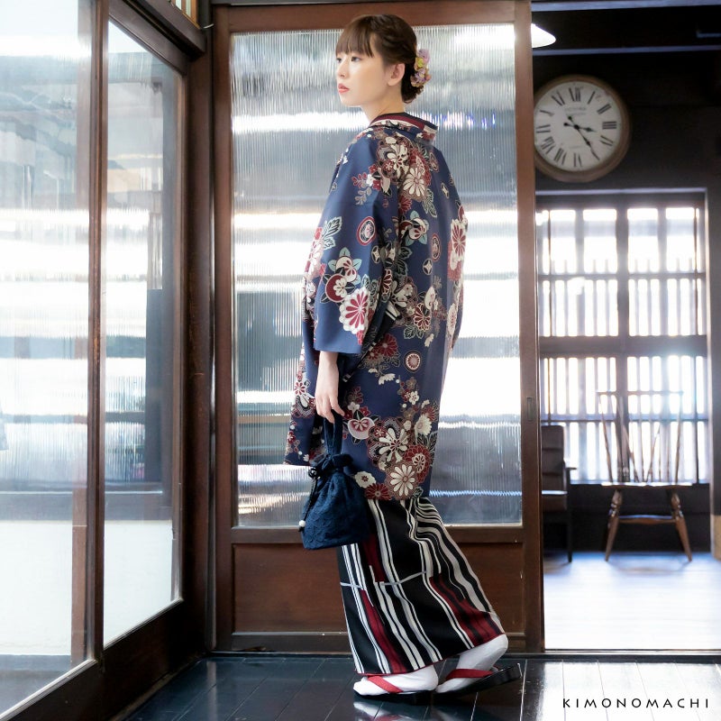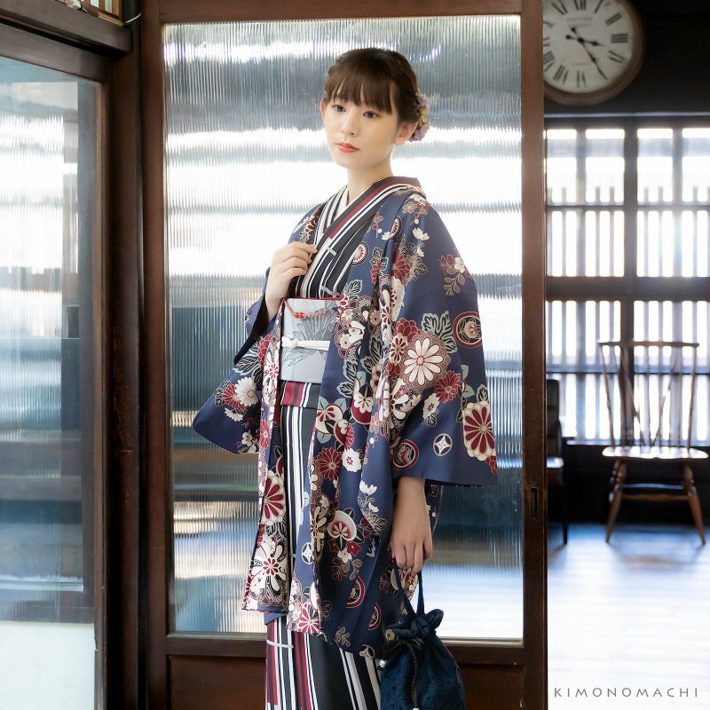 細かな地模様のある生地。グレイッシュな暗めの紺青地に、捻じ花や菊、橘、梅などさまざまな花紋、松や七宝の小さな丸紋を散らしたデザイン。柄は臙脂、白、グレーを黒で引き締めた配色。古典的な格調高さとシックな色使いが大人におすすめです。裏地は臙脂。