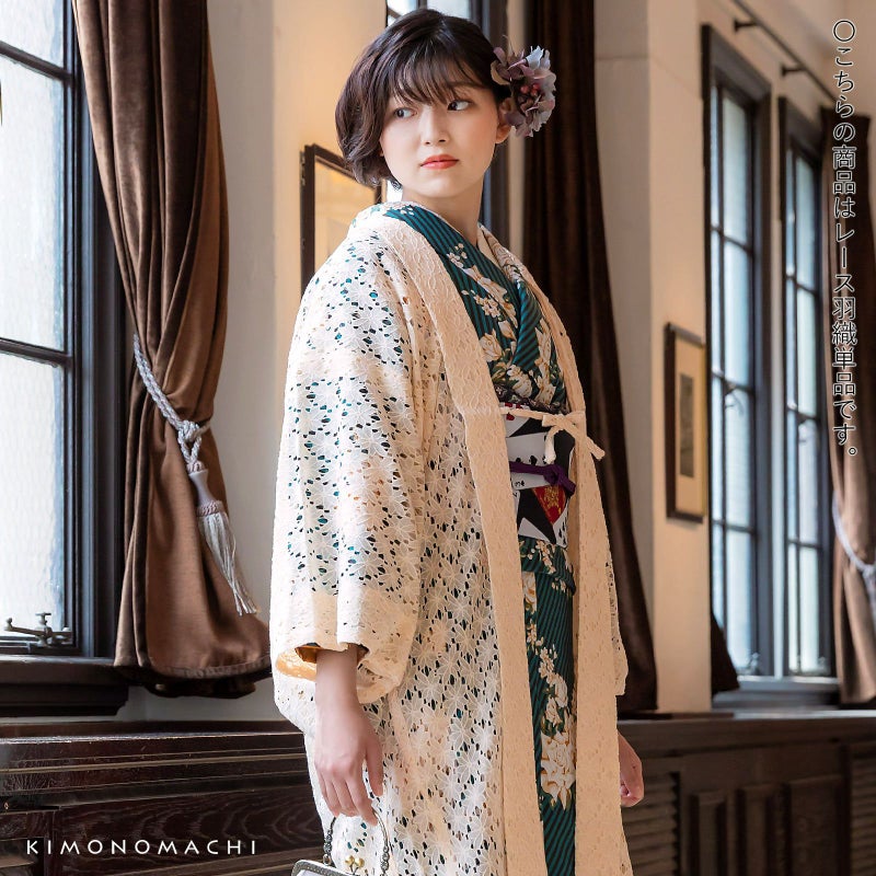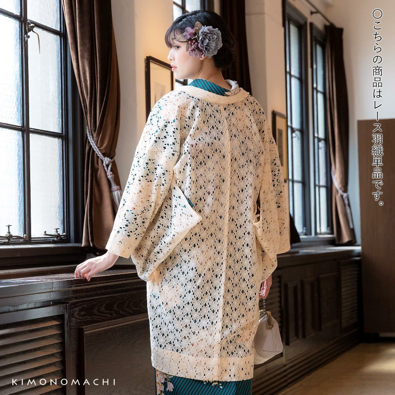 エレガントなフラワーレースの羽織。柔らかな透け感がお着物に合わせやすく、お洒落な雰囲気をプラスしてくれます。