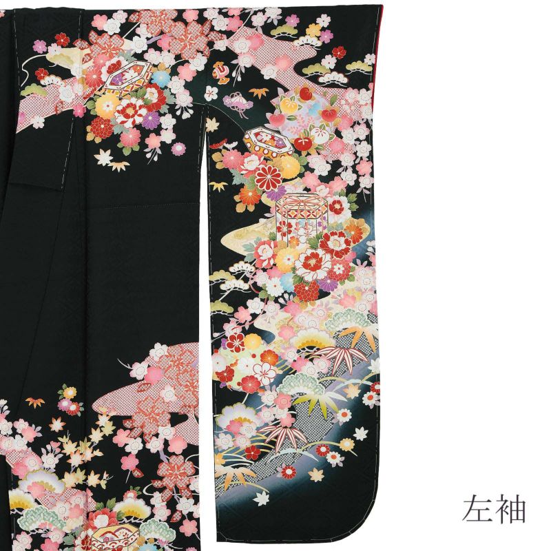 菊唐草の菱の地模様が浮かび上がる黒の地。ピンクを基調とした枝垂桜に、橘や梅などの花の丸。裾には赤の疋田、淡いベージュの霞。その上にやわらかな橙色や緑、紫、水色で松や笹、椿や菊、牡丹など四季の草花の中に貝桶が華やかに表現されています。彩り豊かな吉祥文様に、金彩や金駒刺繍が上品な輝きを添えています。八掛は赤の紗綾形に唐草の地模様。
