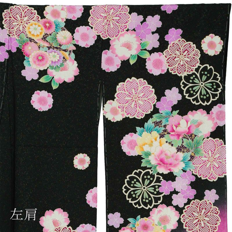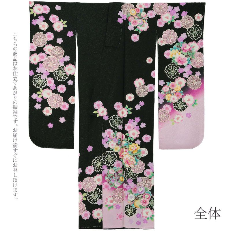 【新古品】お仕立て上がり 振袖単品 「黒地 八重桜に花の丸」 振袖 振り袖成人式 結婚式 結納 パーティー 【メール便不可】