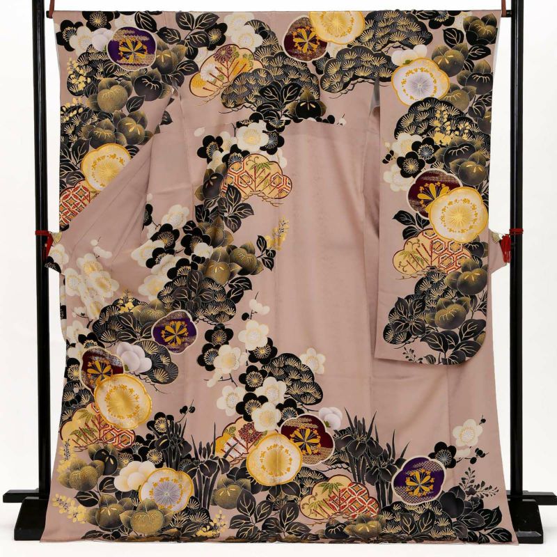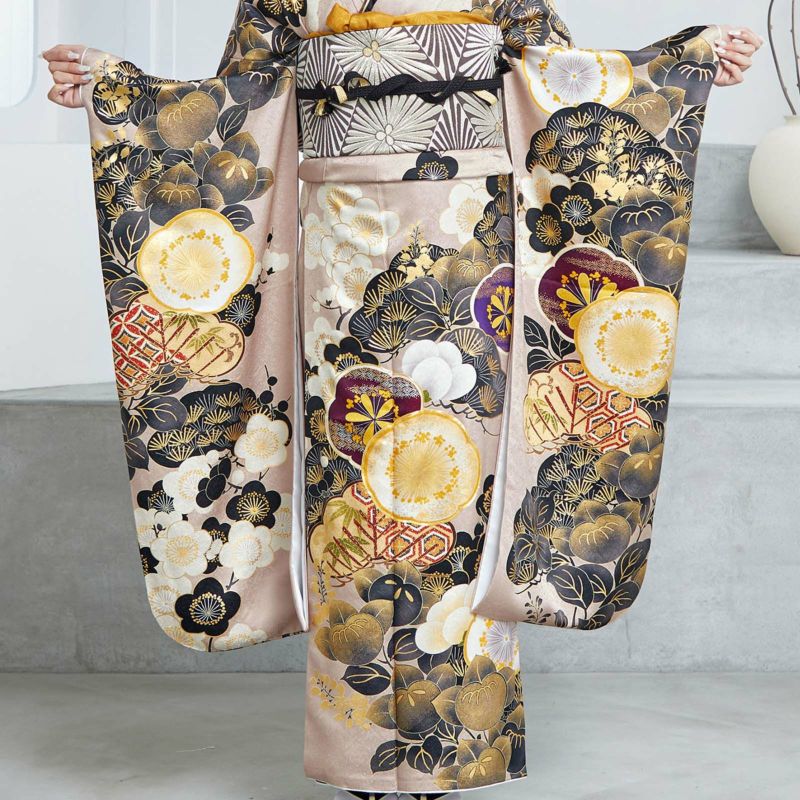 やわらかなピンクベージュ地に重厚感のある黒色で描かれた松と橘が印象的な振袖です。中心の梅がアクセントとなり、クールな中にもかわいらしさを落とし込んだデザインとなっています。レトロながらも、くすみカラーでトレンドを押さえており、成人式では目を引く事間違いありません!卒業式では印象を変えて小物を黒でまとめてシックに着ていただくのもおすすめです。