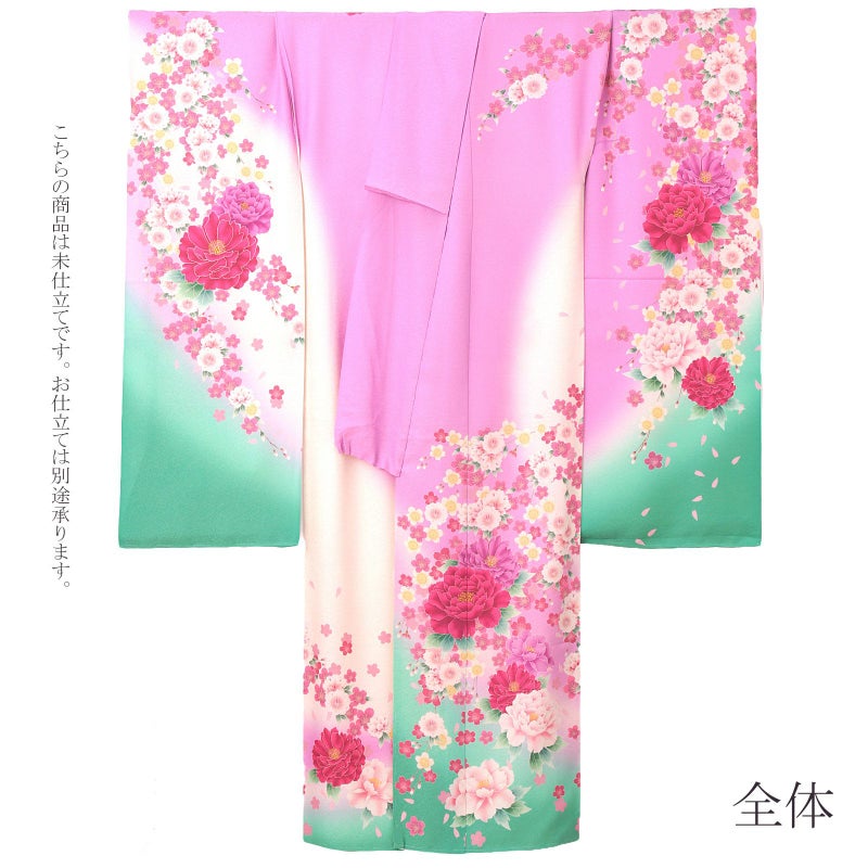 成人式や結婚式などに 華やかな未仕立て振袖単品 (卒業式応援Point10倍 2/19迄)未仕立て 振袖 単品 「ピンク×ミントグリーン 牡丹」 仮絵羽 振り袖 正絹 着物 レディース 成人式 結婚式 結納 パーティー 晴れ着 【メール便不可】