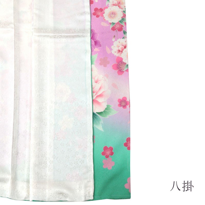 細かな地模様のある白地に、肩裾にかけて紫みのピンク、ミントグリーンのぼかし。ピンク色系の桜に、赤紫や薄ピンク、藤色の牡丹。細かなラメ感のある金通しの地が繊細なきらめきを添えます。八掛は桜の地模様の白。
