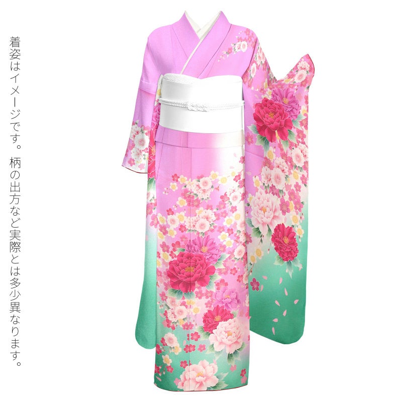 4. (卒業式応援Point10倍 2/19迄)未仕立て 振袖 単品 「ピンク×ミントグリーン 牡丹」 仮絵羽 振り袖 正絹 着物 レディース 成人式 結婚式 結納 パーティー 晴れ着 【メール便不可】