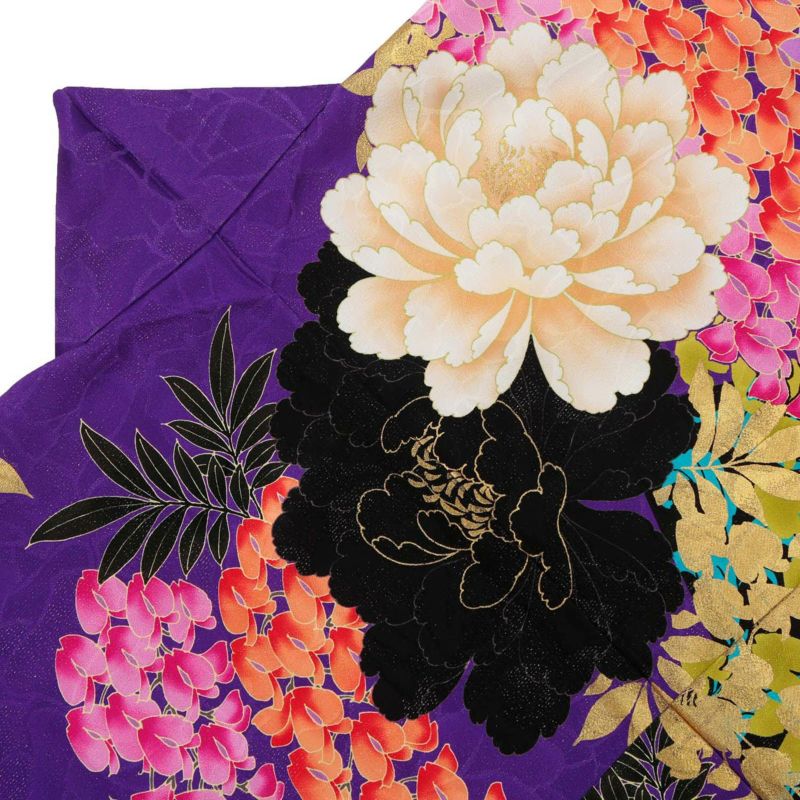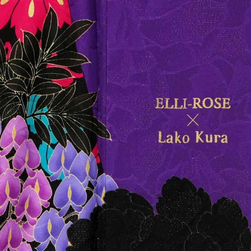 紫色に黒を配した地色、黒地部分には赤・ブルーで唐草文様を描き、白赤黒に大きな牡丹と藤の花房を描いた大変豪華かつ大胆なお振袖です。ブランド名のLako Kulaはハワイ語で宝石の意味を持ち、この振袖を着る女性すべてを宝石のように輝かせる力強い振袖に仕上げました。色・柄・構図など他に類のないお着物をぜひ。