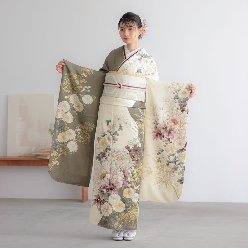 未仕立て 振袖 22点セット「オフホワイト×茶 菊牡丹に笹」仮絵羽 振り袖 正絹 着物 ブランド振袖 成人式 結婚式 結納 パーティー 晴れ着