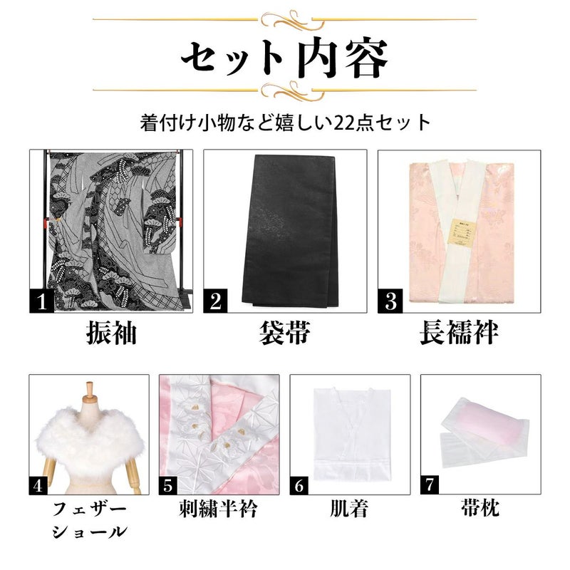 【商品内容】振袖(仮絵羽・未仕立て)、袋帯(未仕立て)、長襦袢(未仕立て)、ショール、刺繍半衿、肌着、帯枕、帯前板、帯後板、衿芯、伊達締め2本、コーリンベルト、三重仮紐、腰紐6本、足袋、着物ハンガー、振袖お仕立て、帯お仕立て、襦袢お仕立て、半衿縫い付け、胴裏正絹、長襦袢正絹の計22点セット