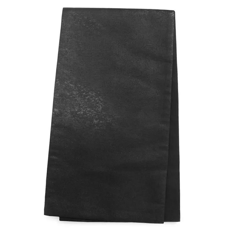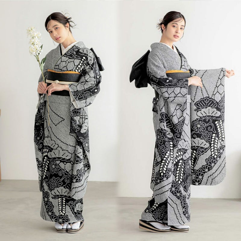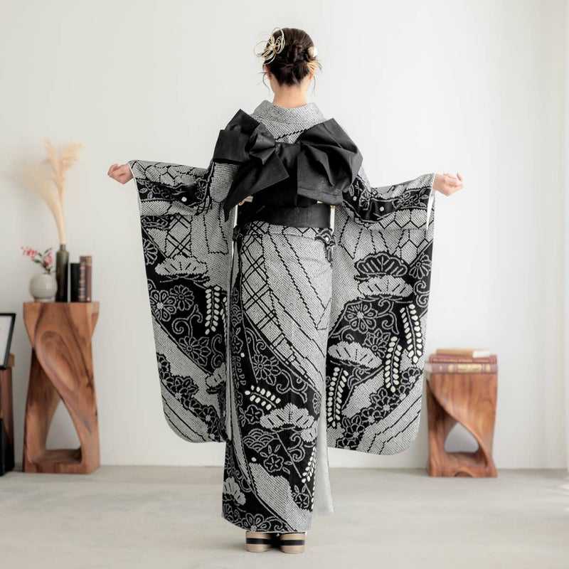 総絞りは日本の伝統的な染色技法で、布を糸で縛ったり、折りたたんだりして防染し、その後染料で染めることで模様を作り出す技法です。布全体に絞りの模様を施すため、非常に手間がかかり、制作に長い時間がかかります。この振袖には、黒と白を基調とし熨斗の柄と藤の大胆な構図を繊細な模様で総絞りで立体的に表現されており、その複雑で美しい模様と、手仕事の温かみが感じられる、職人技が光る一着となっています。