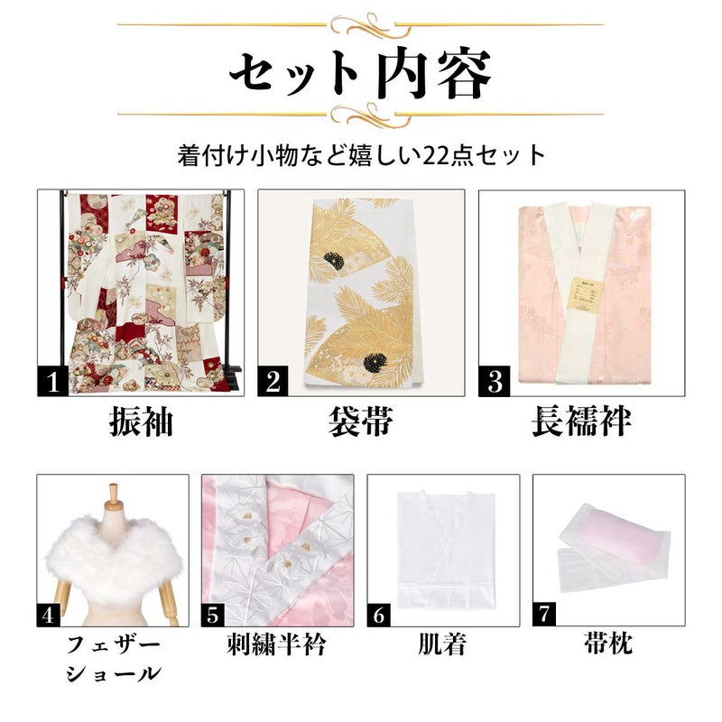 【商品内容】振袖(仮絵羽・未仕立て)、袋帯(未仕立て)、長襦袢(未仕立て)、ショール、刺繍半衿、肌着、帯枕、帯前板、帯後板、衿芯、伊達締め2本、コーリンベルト、三重仮紐、腰紐6本、足袋、着物ハンガー、振袖お仕立て、帯お仕立て、襦袢お仕立て、半衿縫い付け、胴裏正絹、長襦袢正絹の計22点セット