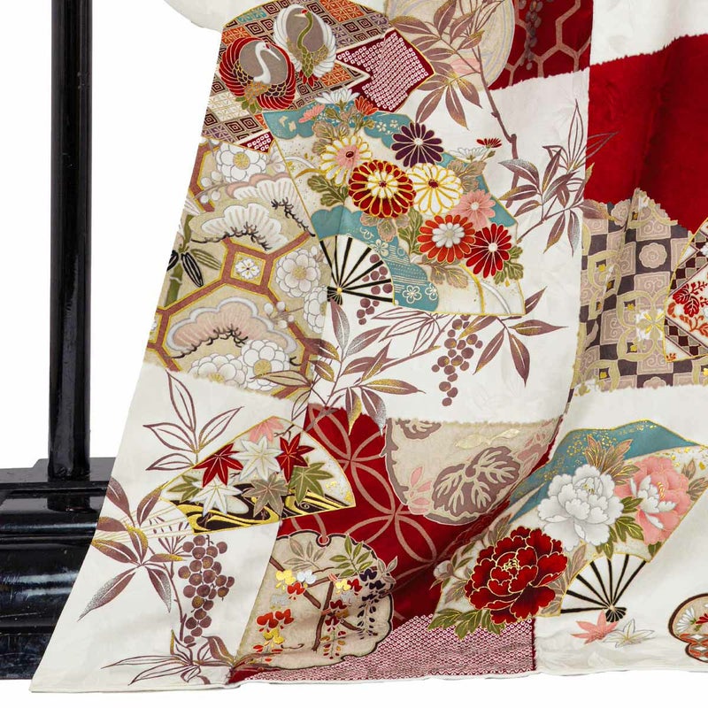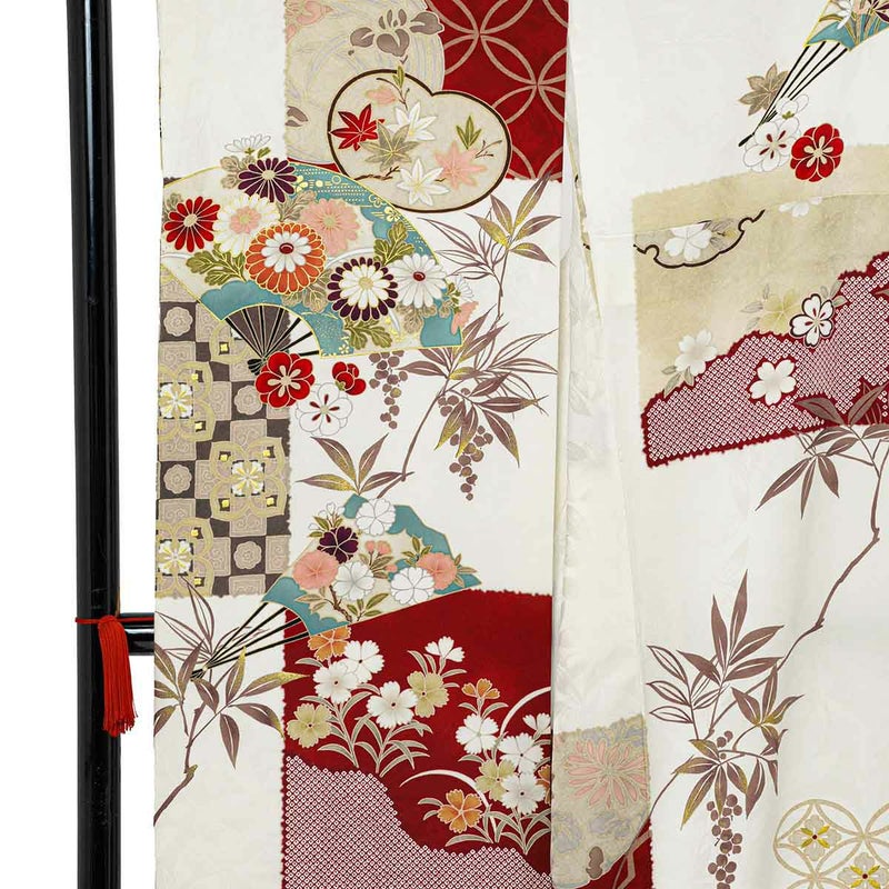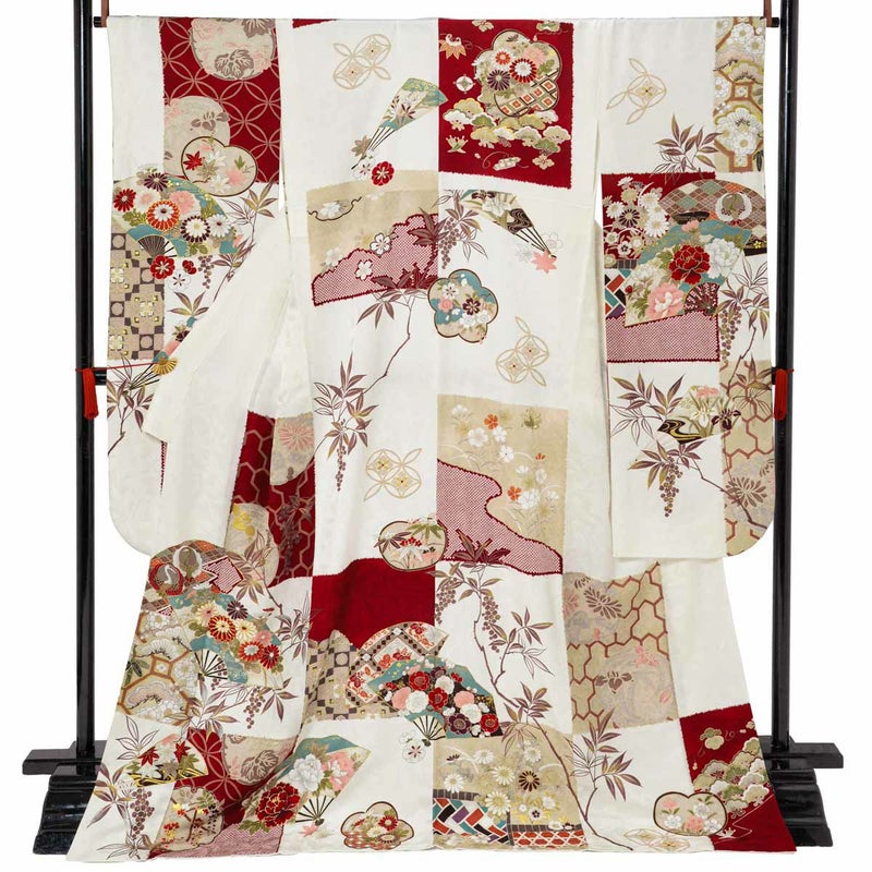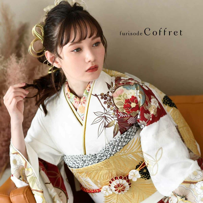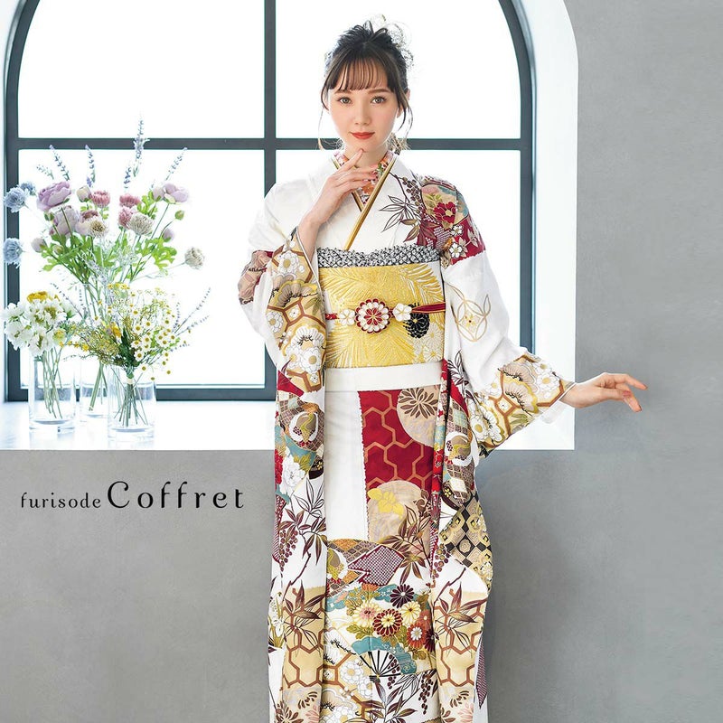 フランス語で宝石箱の意味合いを持つ「Coffret」。まるで宝石のように美しい振袖がコンセプトかのように、扇面市松模様に四季折々の花々、赤と白のコントラストが華やかさを一層引き立てています。また、全面に柄を施すのではなく、市松に沿って柄が描かれているため、絶妙な余白バランスの取れたデザイン性の高いお振袖となっています。