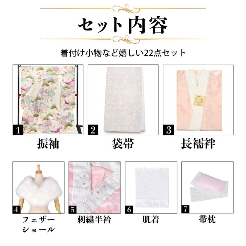 【商品内容】振袖(仮絵羽・未仕立て)、袋帯(未仕立て)、長襦袢(未仕立て)、ショール、刺繍半衿、肌着、帯枕、帯前板、帯後板、衿芯、伊達締め2本、コーリンベルト、三重仮紐、腰紐6本、足袋、着物ハンガー、振袖お仕立て、帯お仕立て、襦袢お仕立て、半衿縫い付け、胴裏正絹、長襦袢正絹の計22点セット