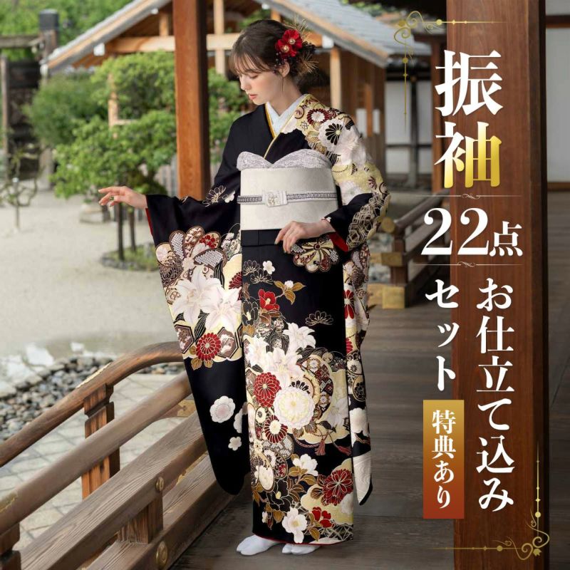 【商品内容】振袖(仮絵羽・未仕立て)、袋帯(未仕立て)、長襦袢(未仕立て)、ショール、刺繍半衿、肌着、帯枕、帯前板、帯後板、衿芯、伊達締め2本、コーリンベルト、三重仮紐、腰紐6本、足袋、着物ハンガー、振袖お仕立て、帯お仕立て、襦袢お仕立て、半衿縫い付け、胴裏正絹、長襦袢正絹の計22点セット