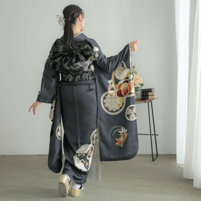 グレー地に花丸文を施した、スタイリッシュな「Dear」のお着物です。梅の模様に金駒刺繍を施すことで、シンプルながらも華やかな印象になっています。最近人気のブーツを合わせるスタイルにもピッタリです! 小物の合わせ方によって様々な雰囲気で着ていただける振袖なので、自分らしいコーディネートを楽しんでください。