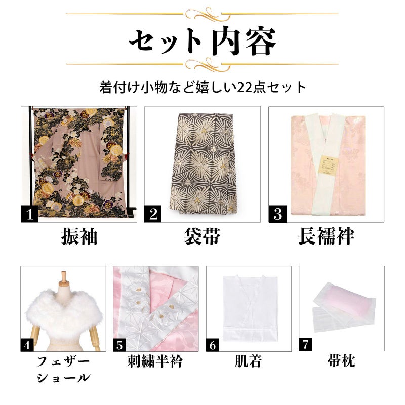 【商品内容】振袖(仮絵羽・未仕立て)、袋帯(未仕立て)、長襦袢(未仕立て)、ショール、刺繍半衿、肌着、帯枕、帯前板、帯後板、衿芯、伊達締め2本、コーリンベルト、三重仮紐、腰紐6本、足袋、着物ハンガー、振袖お仕立て、帯お仕立て、襦袢お仕立て、半衿縫い付け、胴裏正絹、長襦袢正絹の計22点セット