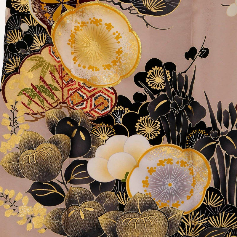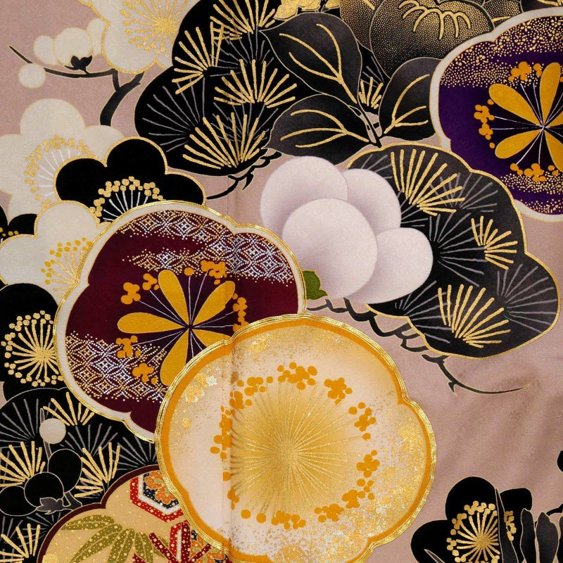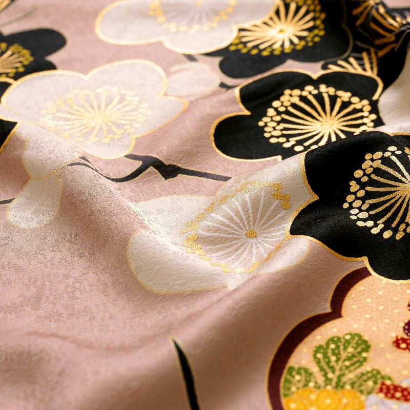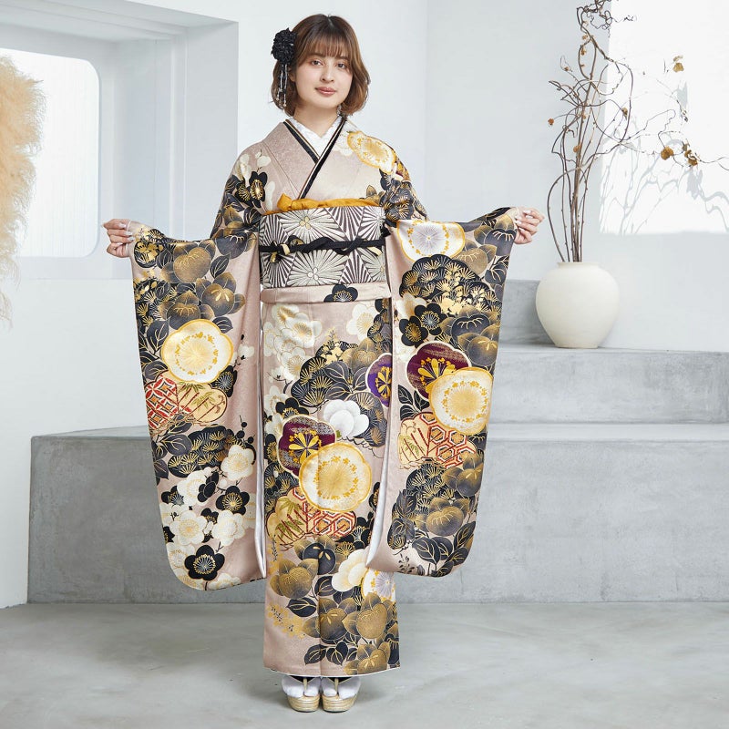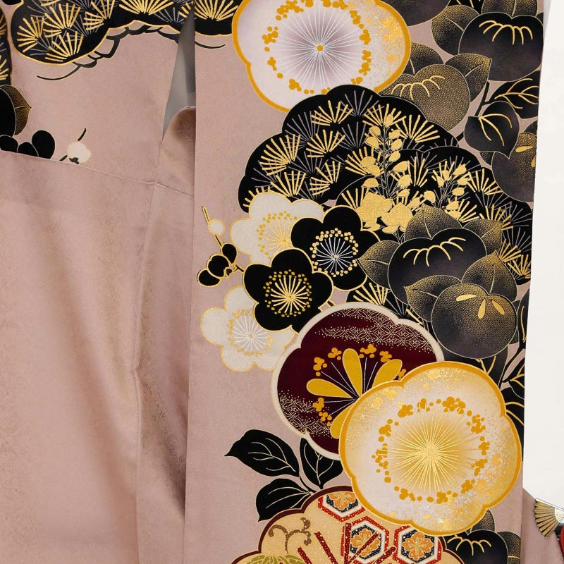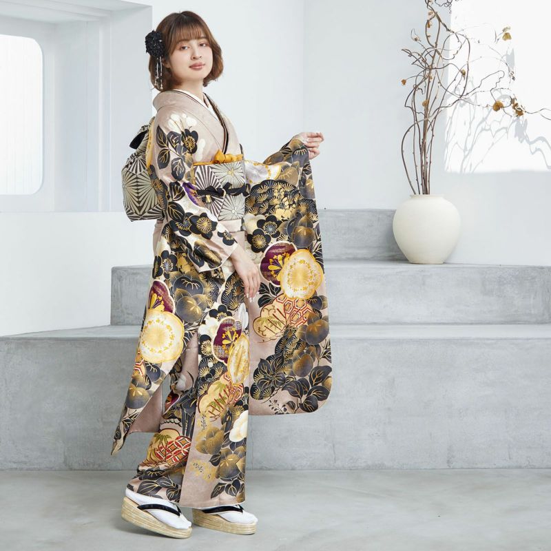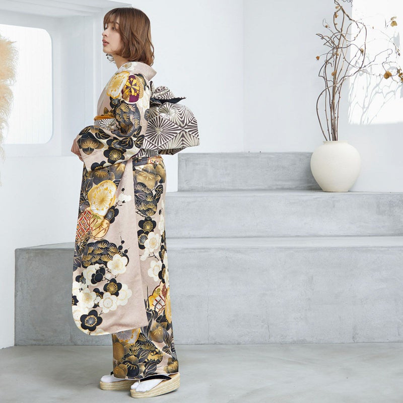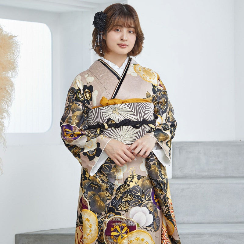 やわらかなピンクベージュ地に重厚感のある黒色で描かれた松と橘が印象的な振袖です。中心の梅がアクセントとなり、クールな中にもかわいらしさを落とし込んだデザインとなっています。レトロながらも、くすみカラーでトレンドを押さえており、成人式では目を引く事間違いありません!卒業式では印象を変えて小物を黒でまとめてシックに着ていただくのもおすすめです。