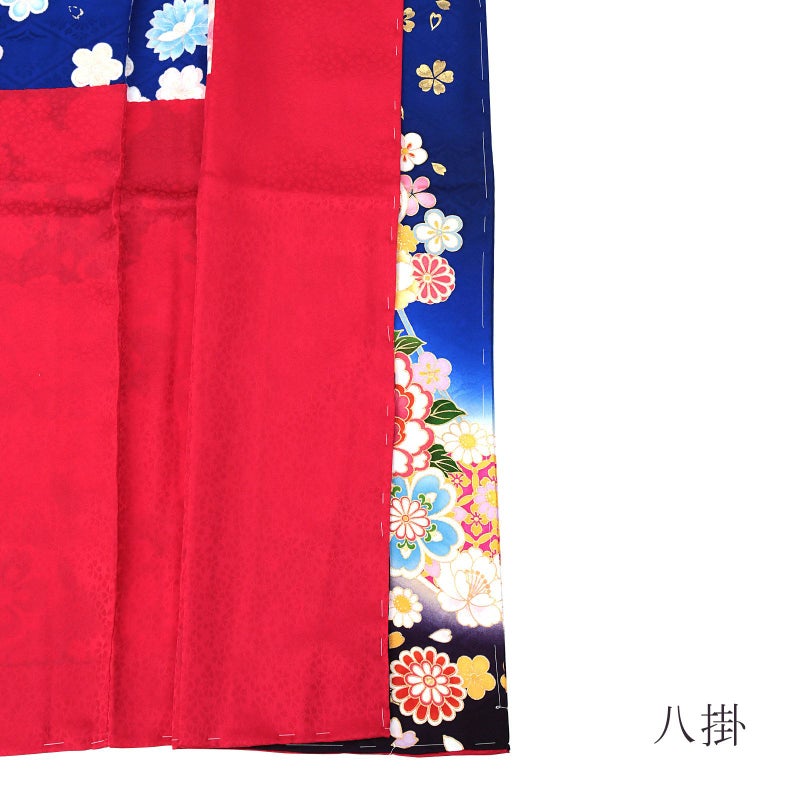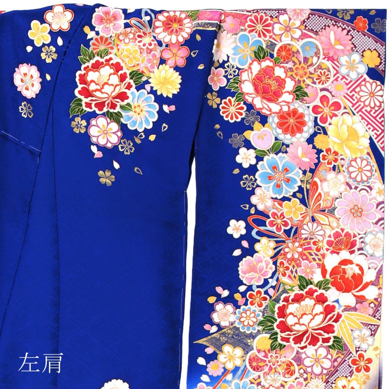 菱に菊桐紋の地模様の鮮やかな青色の地。裾は紫紺のぼかし。ピンク、藤色などの熨斗に、白、赤、ピンクや水い色、薄黄色、橙色の鈴、牡丹に蝶。金彩が華麗な高級感を演出します。八掛は小桜の地模様の赤。