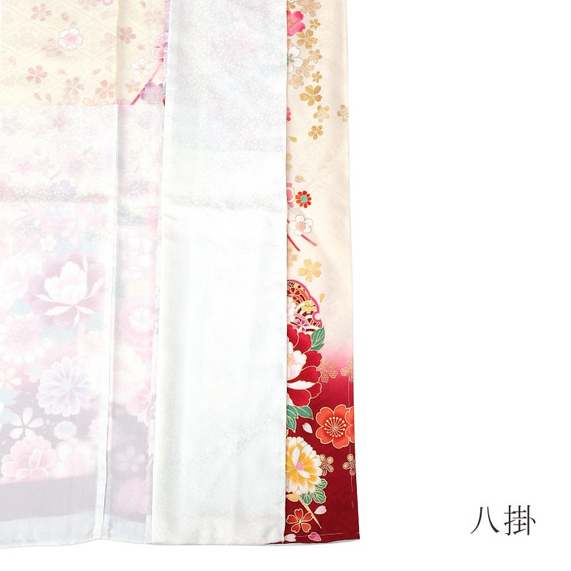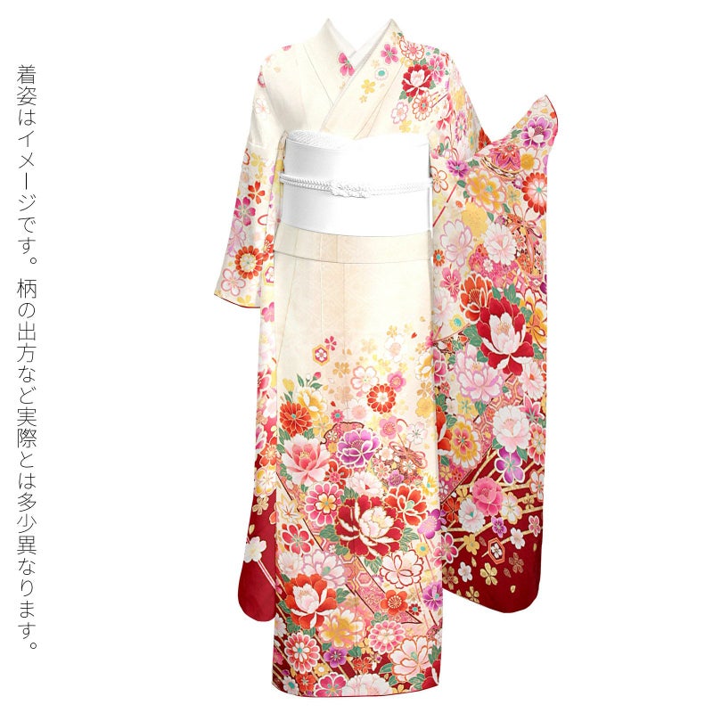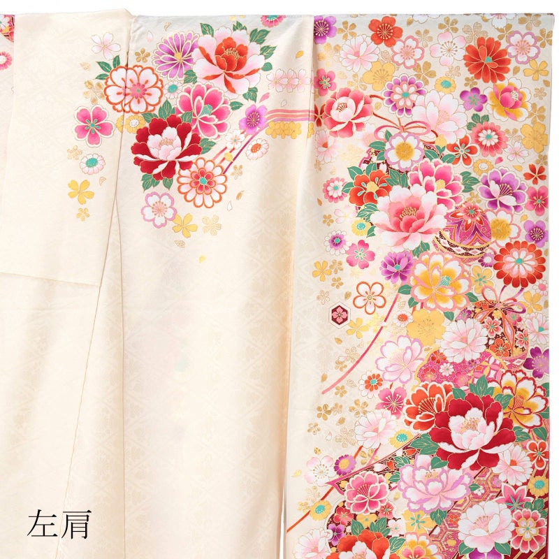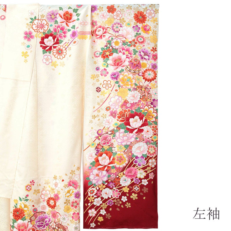 菱に菊桐紋の地模様の淡い生成り色の地。裾は赤のぼかし。赤、ピンク、薄黄色、青磁色などの熨斗に雪輪、鈴、手毬、牡丹や桜、菊などの花模様。金彩が華麗な高級感を演出します。八掛は小桜の地模様の白。