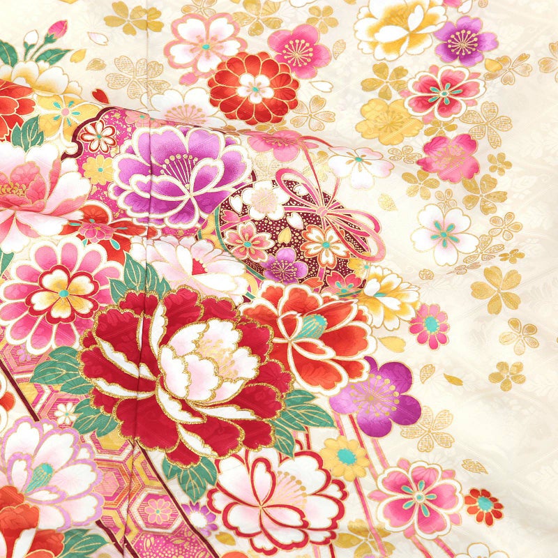 5. (卒業式応援Point10倍 3/19迄)未仕立て 振袖 単品 「生成り色 牡丹に雪輪、桜」 仮絵羽 振り袖 正絹 着物 レディース 成人式 結婚式 結納 パーティー 晴れ着 【メール便不可】