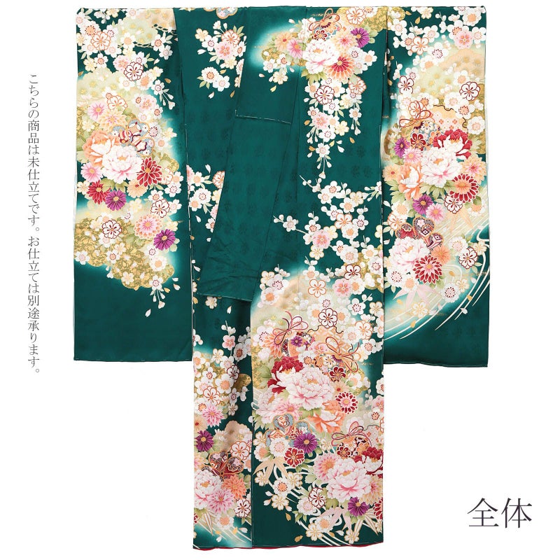5. (卒業式応援Point10倍 3/19迄)未仕立て 振袖 単品 「花緑青 牡丹、雪輪に鈴」 仮絵羽 振り袖 正絹 着物 レディース 成人式 結婚式 結納 パーティー 晴れ着 【メール便不可】