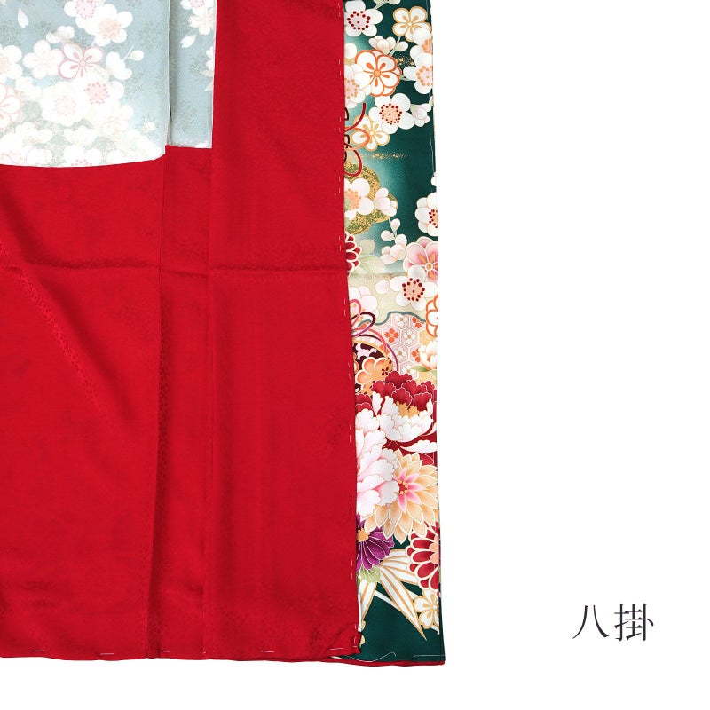 花に紗綾形の地模様の深い青緑の地。淡い薄緑ぼかしに白、赤、ピンクの桜に梅、松竹。薄桃色や紅、淡い橙色に紫、水色の牡丹や菊の花々、鈴に雪輪。金の刺繍や金彩が煌びやかさを添えます。八掛は、小桜の地模様の赤。