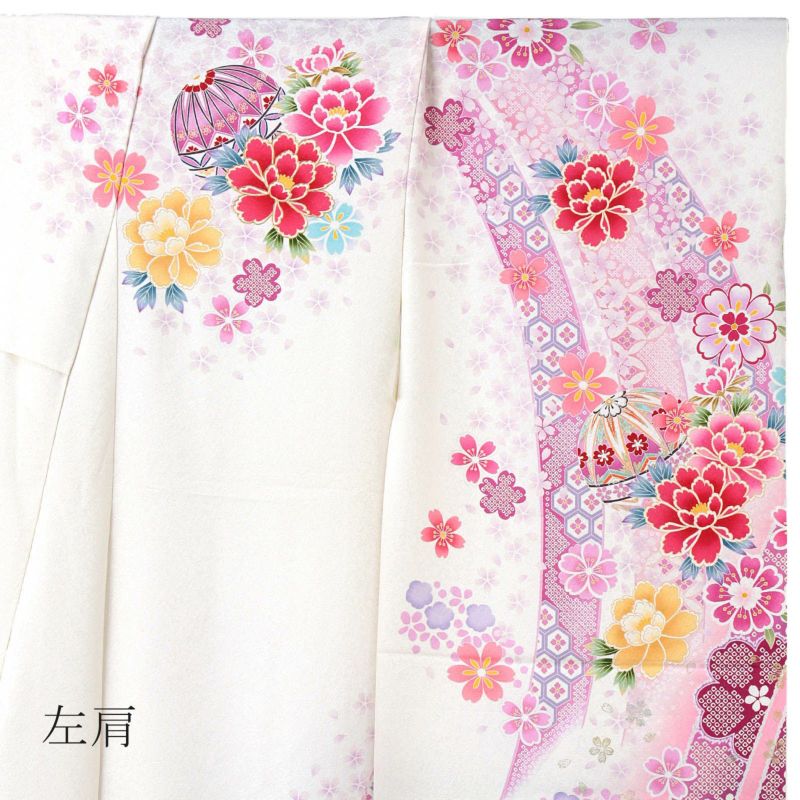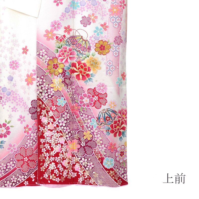 金通しに細かな地模様のある白地。裾は深い赤。淡いピンクや藤色の熨斗に小桜、牡丹に手毬。ポイントの金彩やラメ、刺繍が細やかで煌びやかな雰囲気です。八掛は薄ピンクの小桜の地模様。