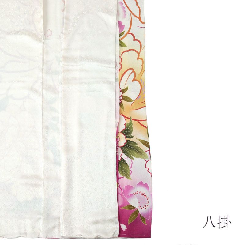 金通しに細かな地模様のある白地。裾は赤紫みの深いピンク。水色や橙色、深いピンクの輪郭線で表現された牡丹に、クリーム色や淡い藤色の牡丹や桜。ポイントの金彩が大胆で煌びやかな雰囲気です。八掛は白の小桜の地模様。