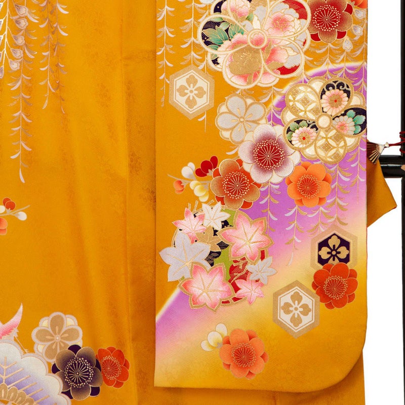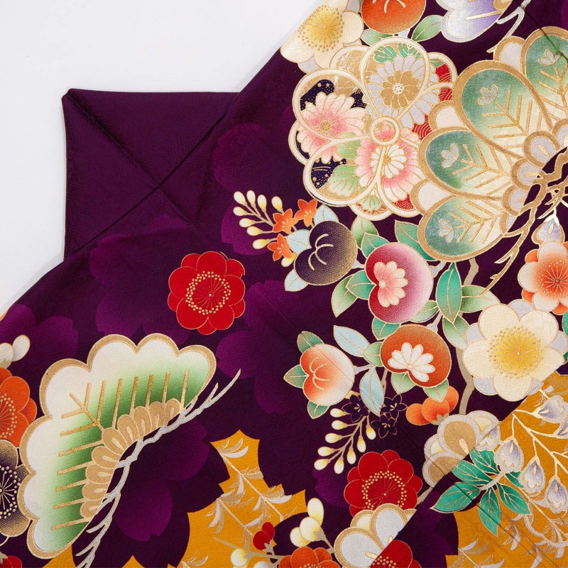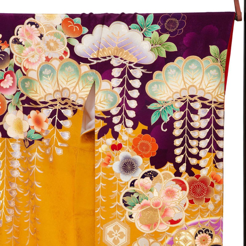 特徴のあるオレンジ色の地色に濃い紫で桜の花のシルエットを描き、松竹梅に桜や藤の花に飛鶴を表現した大胆かつ豪華なお振袖です。重厚さのある豪華な金駒刺繍や刺繍以上に豪華で際立つ光を放つ金彩をたっぷりと施した豪華で煌きのあるお着物です。着る貴女のきっと虜にしてしまう逸品です。