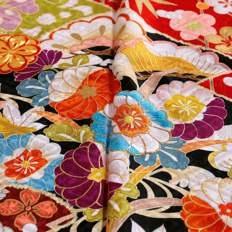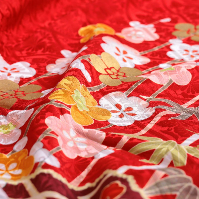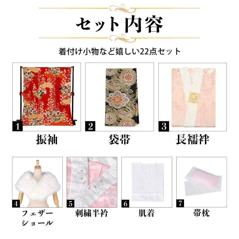 【商品内容】振袖(仮絵羽・未仕立て)、袋帯(未仕立て)、長襦袢(未仕立て)、ショール、刺繍半衿、肌着、帯枕、帯前板、帯後板、衿芯、伊達締め2本、コーリンベルト、三重仮紐、腰紐6本、足袋、着物ハンガー、振袖お仕立て、帯お仕立て、襦袢お仕立て、半衿縫い付け、胴裏正絹、長襦袢正絹の計22点セット
