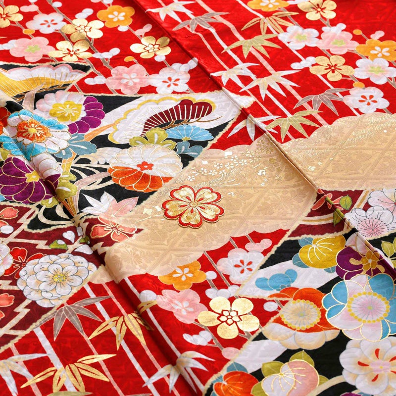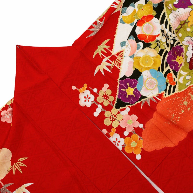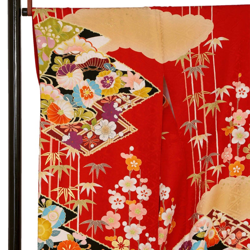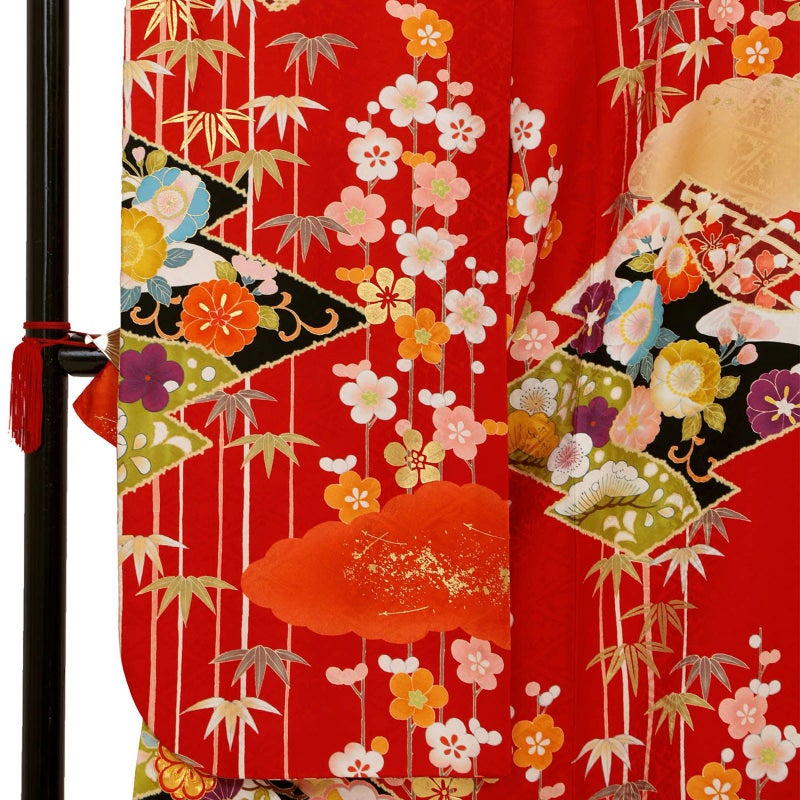 朱色味のある赤の地色に、雲取りに松皮菱を表現し、菊や松に梅や笹竹の文様を配し全体を竹林のようなスキッとしたイメージにまとめた京友禅のお振袖です。竹は古来から物語り中で重要な役割をにないまた、成長を願うシンボル、日本を象徴する文様の一つです。金彩の笹に印象深い黒や、青、紫の色を加えて深みのあるにデザインに仕上がった振袖です。