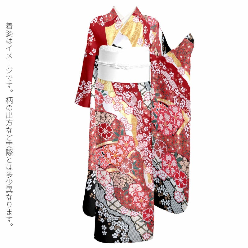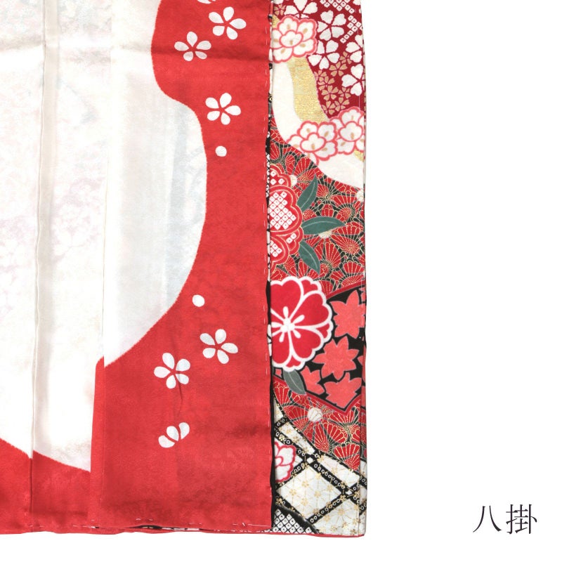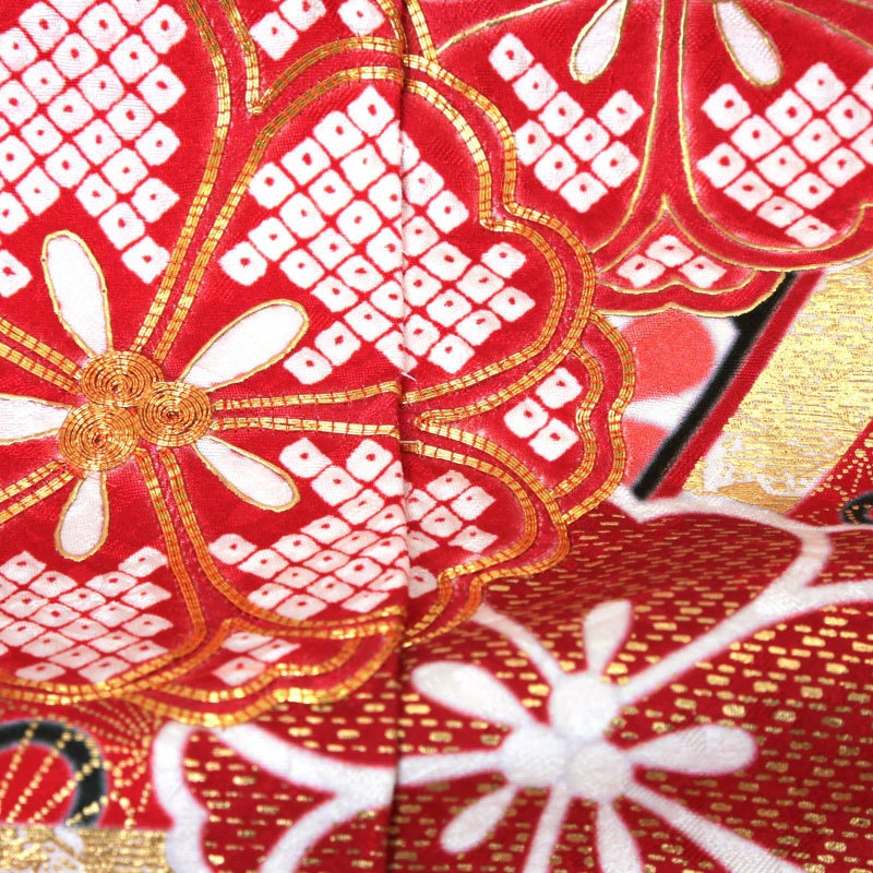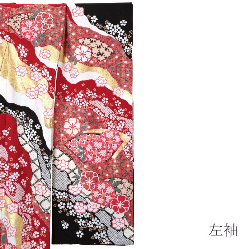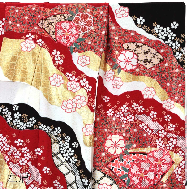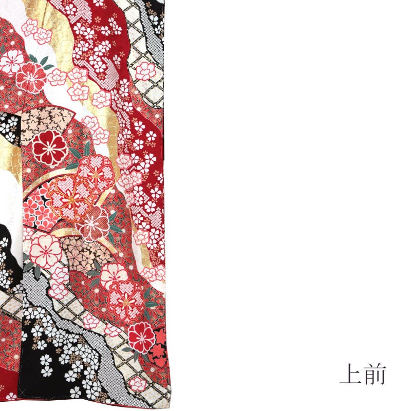 【色柄】卍字に桜の地模様のある生地。赤に白、黒、金の道長取りの中に格子や菊、その上に金彩で菊青海波や桜を重ねた細やかな表現。焦げ茶色にベージュの楓や黒に薄紅の梅の柄の地紙文、桜や牡丹の花紋を散らし、ポイントに金駒刺繍が施された繊細かつ豪華な振袖です。八掛はやわらかい朱色に白の小花。