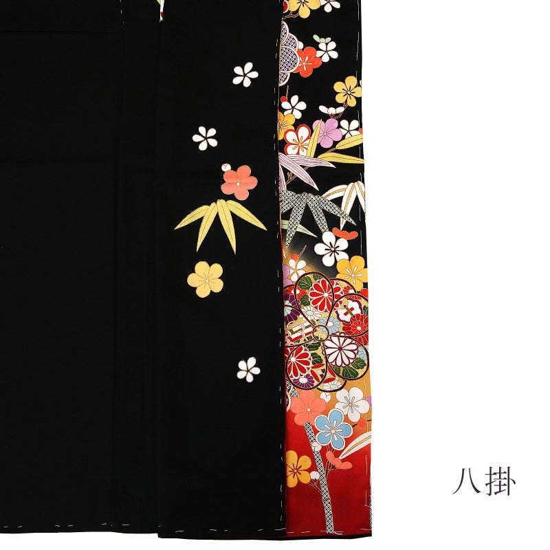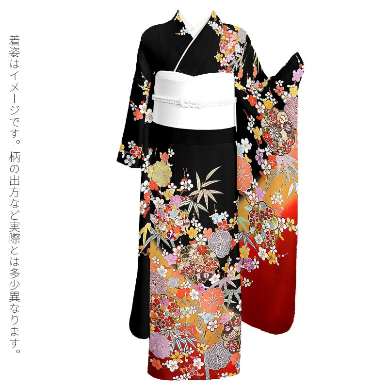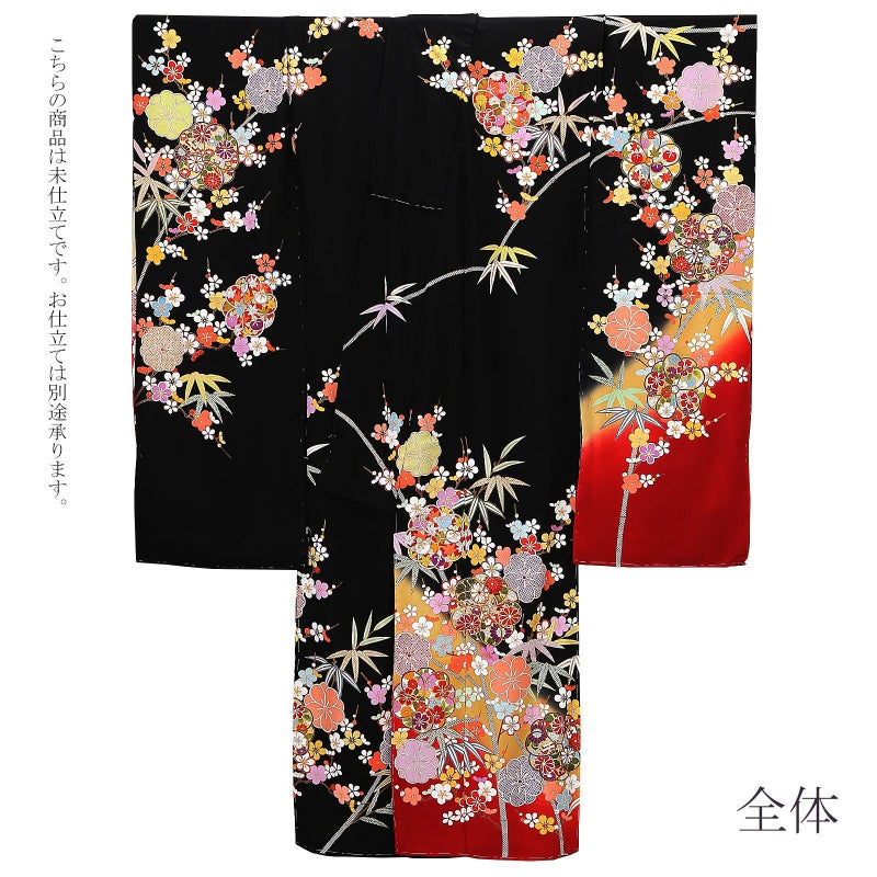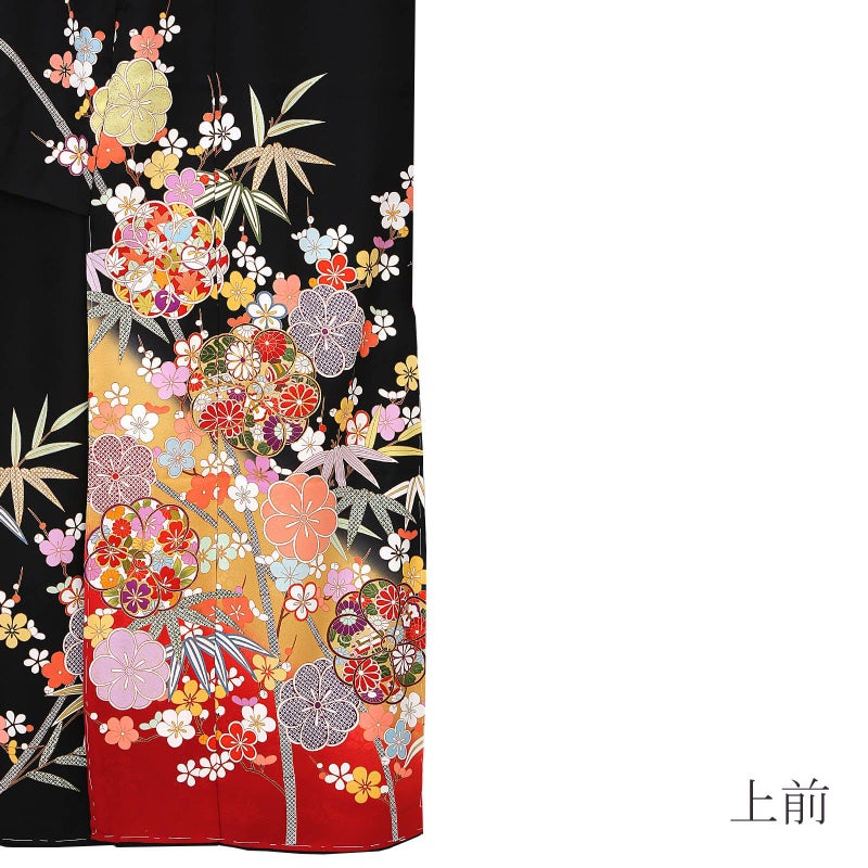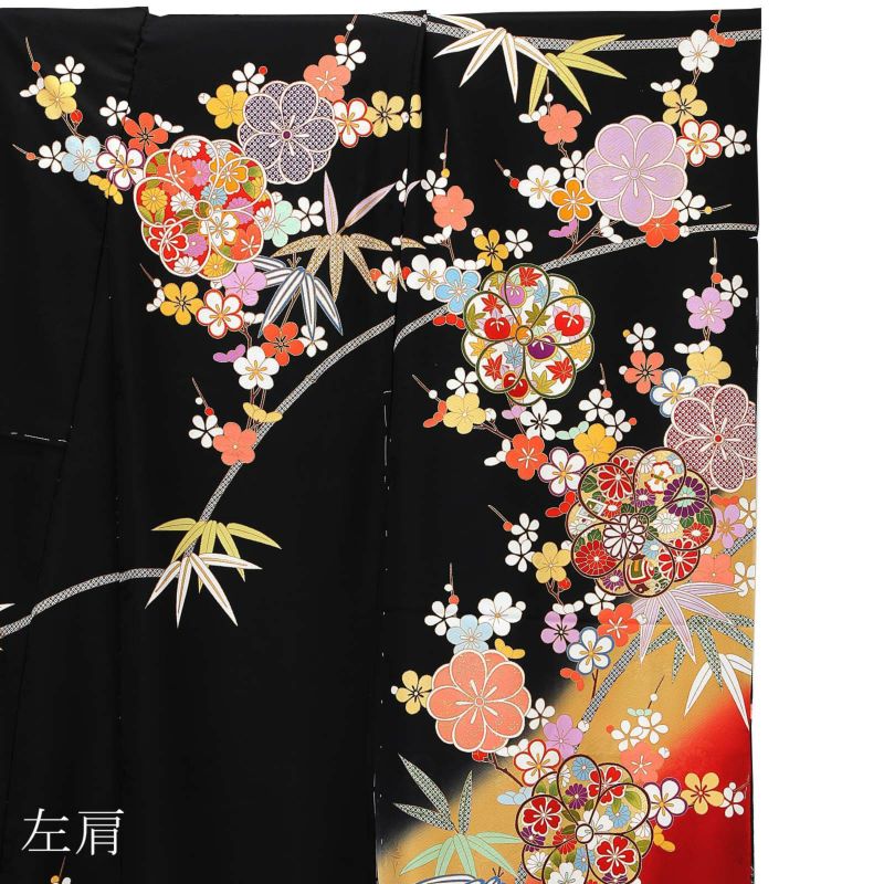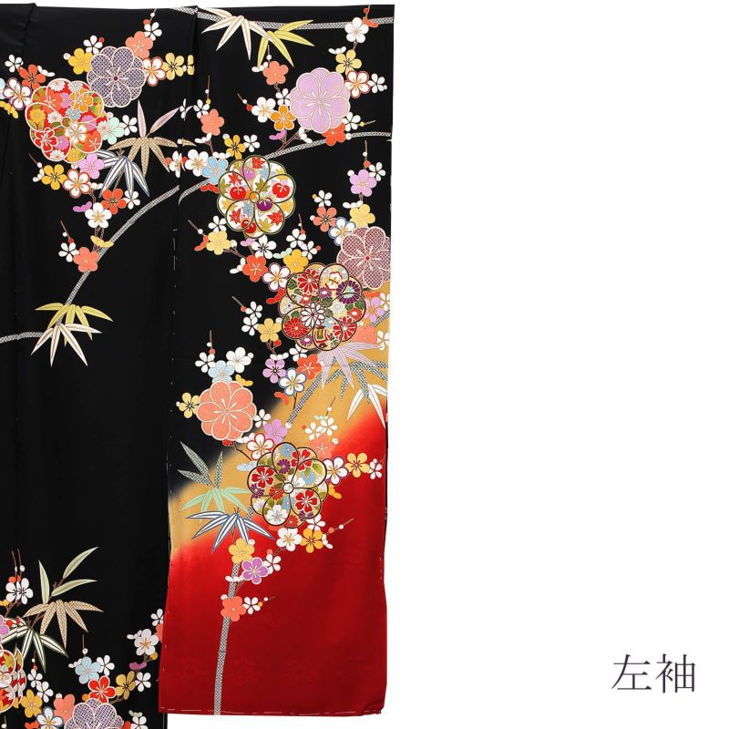 【色柄】紗綾形の地模様のある黒地に、芥子色、赤の裾ぼかし。抽象的な八重梅の中に赤や紫の菊や橘、桜、宝尽くし紋、赤や紫の疋田が表現されています。白、赤、黄色や水色の枝梅に、灰緑や青の竹。ポイントの金彩や金駒刺?が豪華さを添えます。八掛は紗綾形の地模様の黒地に梅と竹紋。