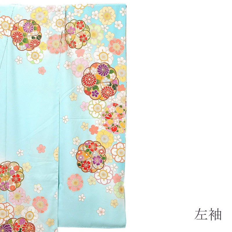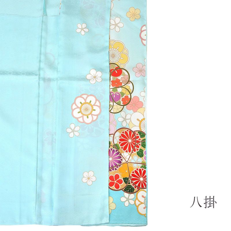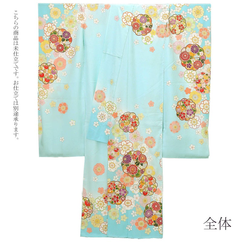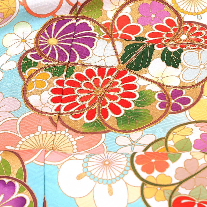 【色柄】紗綾形の地模様のある明るい水色地。茶や深緑の輪郭線の抽象的な八重梅の中に、赤や紫、橙色の菊や橘、桜などの花紋が表現されています。白、ピンク、薄黄色や薄緑色の大小の梅。丸い梅のかわいらしさにポイントの金彩や金駒刺?が豪華さを添えます。八掛は紗綾形の地模様の水色地に梅紋。