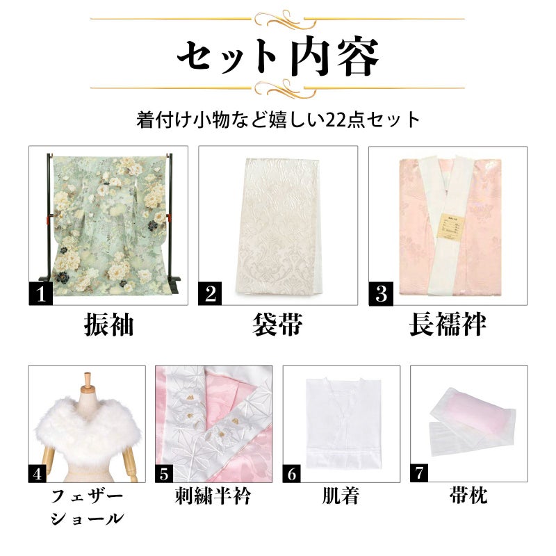 【商品内容】振袖(仮絵羽・未仕立て)、袋帯(未仕立て)、長襦袢(未仕立て)、ショール、刺繍半衿、肌着、帯枕、帯前板、帯後板、衿芯、伊達締め2本、コーリンベルト、三重仮紐、腰紐6本、足袋、着物ハンガー、振袖お仕立て、帯お仕立て、襦袢お仕立て、半衿縫い付け、胴裏正絹、長襦袢正絹の計22点セット